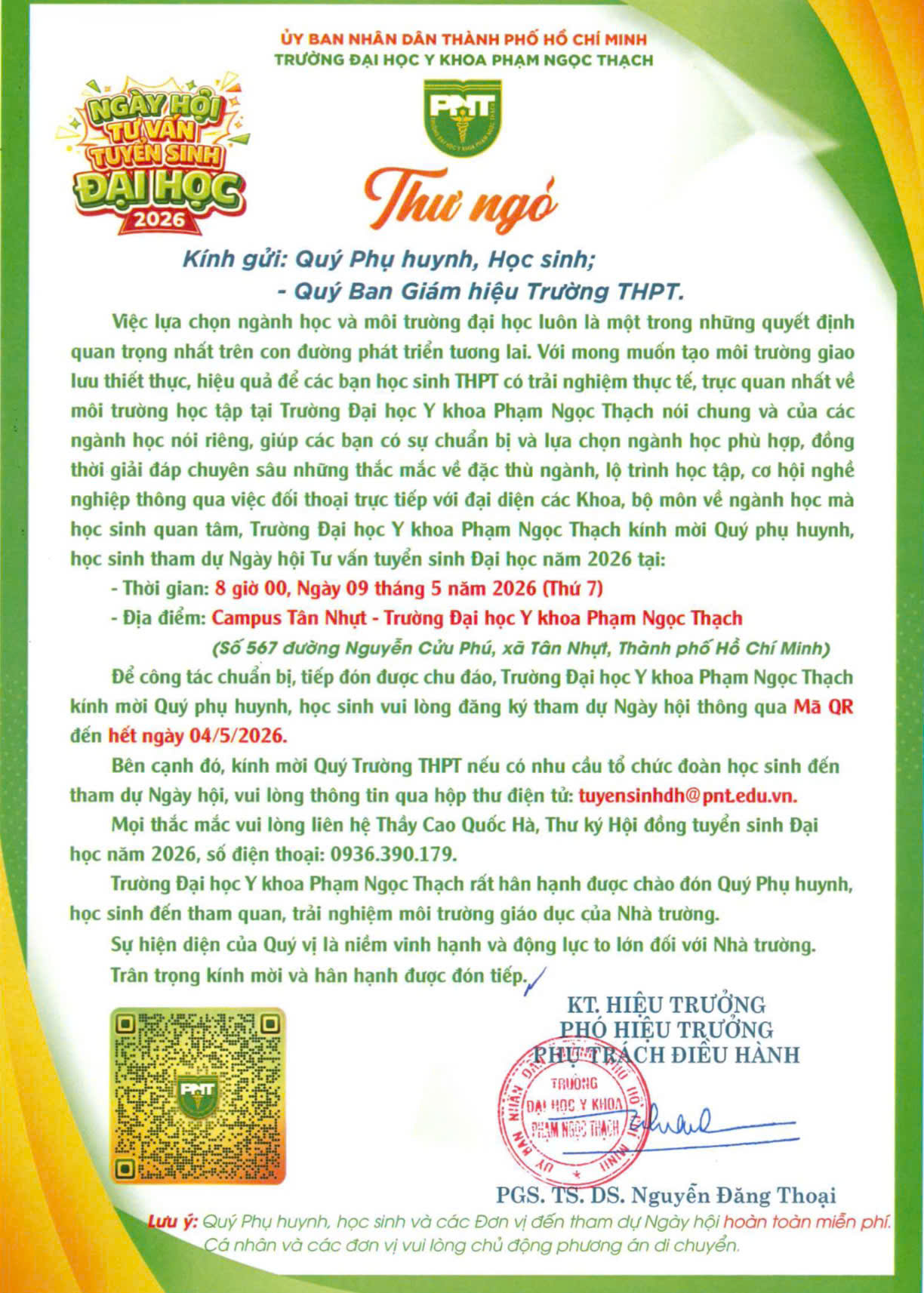 Thư ngỏ: Ngày hội Tư vấn Tuyển sinh Đại học 2026! Của Trường đại học Y khoa Phạm Ngọc Thạch. (Ảnh: QLĐTĐH)