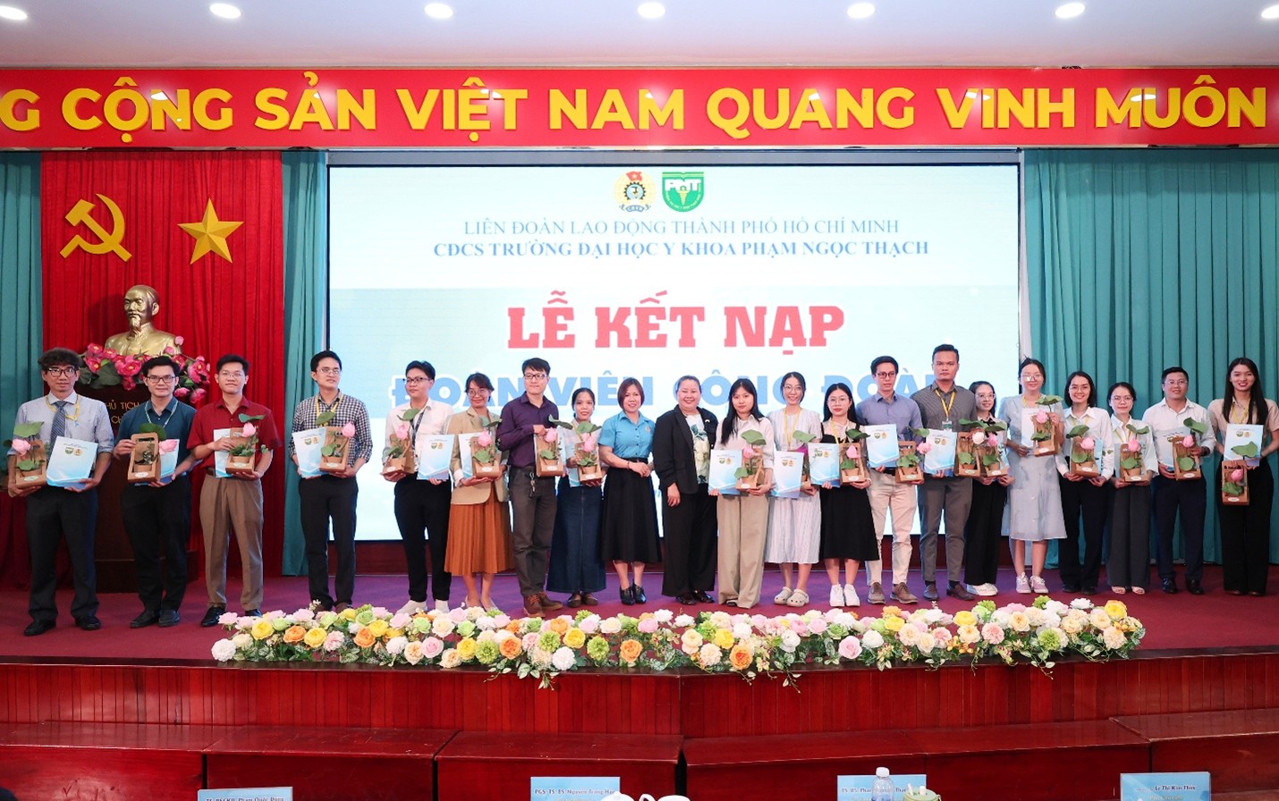 Bà Lê Thị Kim Thúy, Phó Chủ tịch LĐLĐ TPHCM, trao quyết định kết nạp cho đoàn viên mới - Công đoàn cơ sở Trường Đại học Y khoa Phạm Ngọc Thạch. (Ảnh: VPT)
