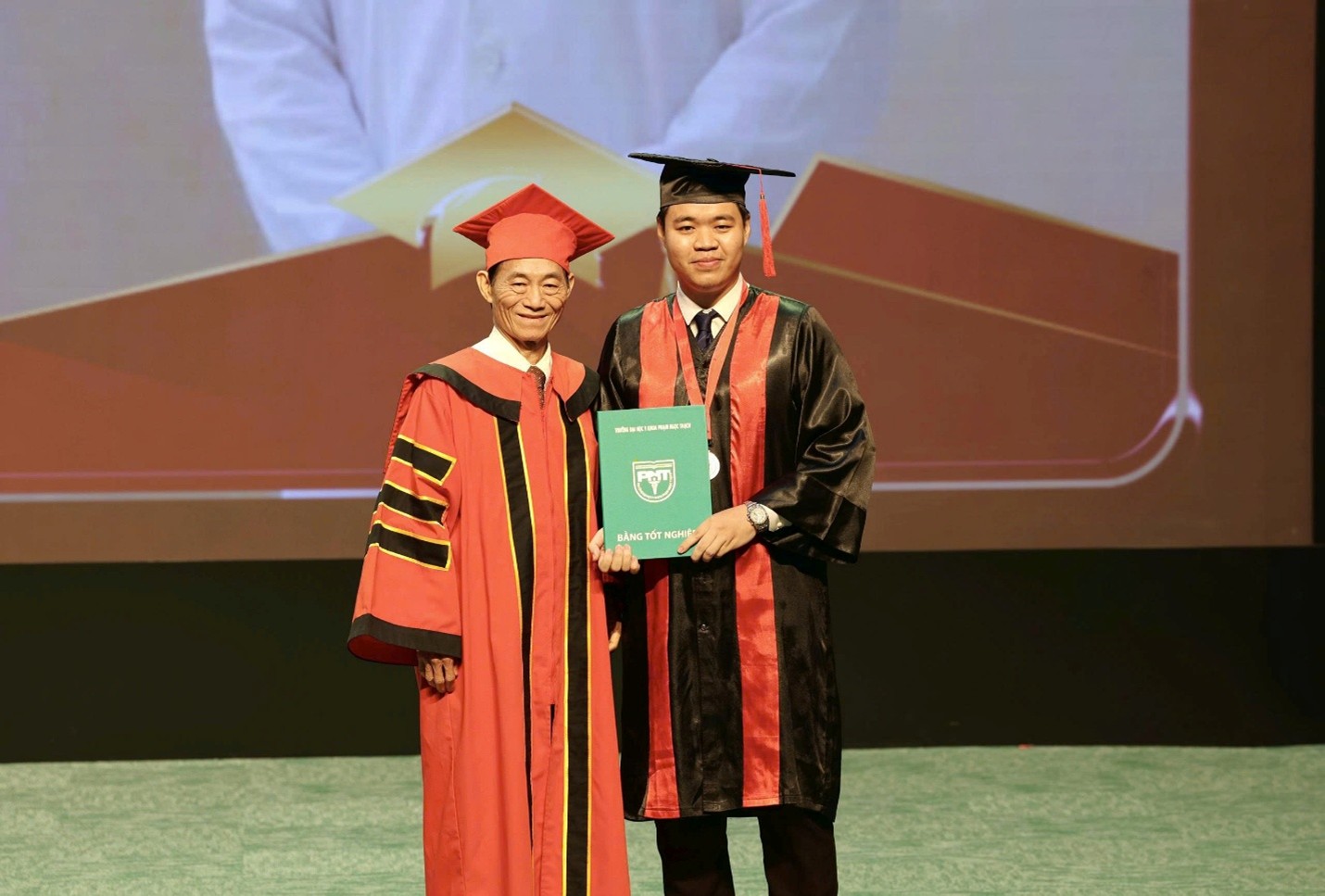 BS. Trần Nguyễn Nhất Tín nhận bằng Thủ khoa Tốt nghiệp Đại học năm 2025 và nhận bằng khen, hoa chúc mừng Thủ khoa Bác sĩ nội trú 2025 - Bộ môn Nội Tổng quát, Trường Đại học Y khoa Phạm Ngọc Thạch. (Ảnh: VPT)