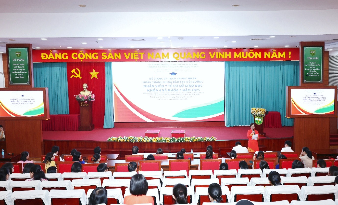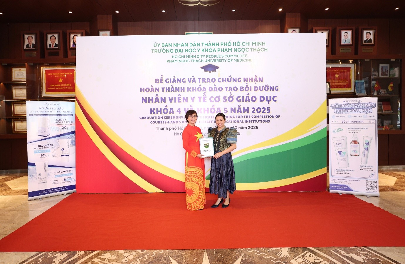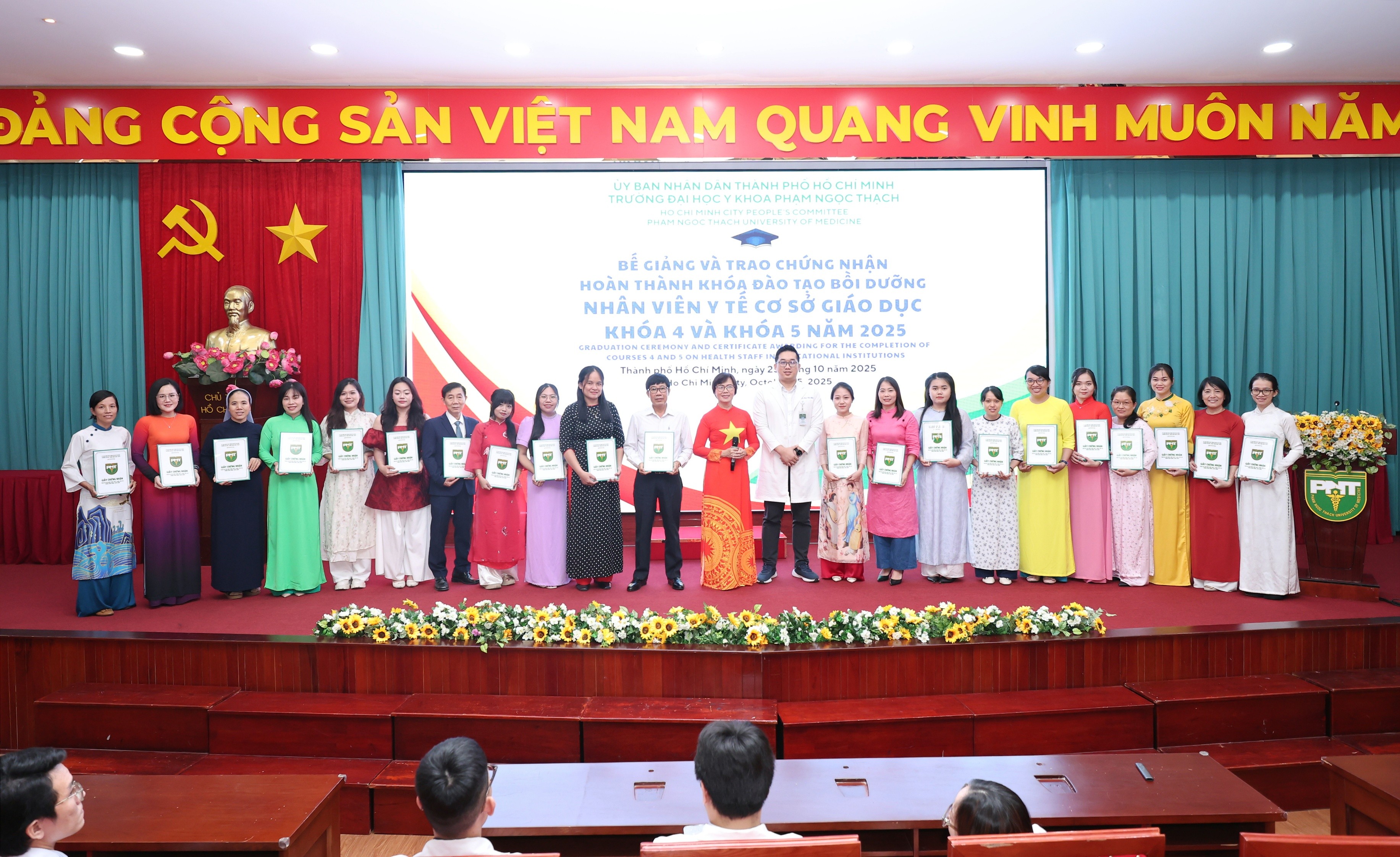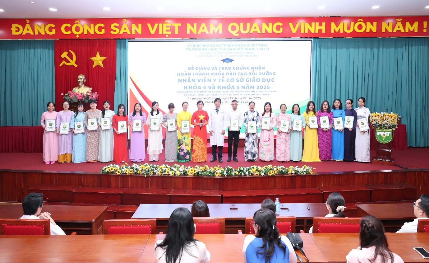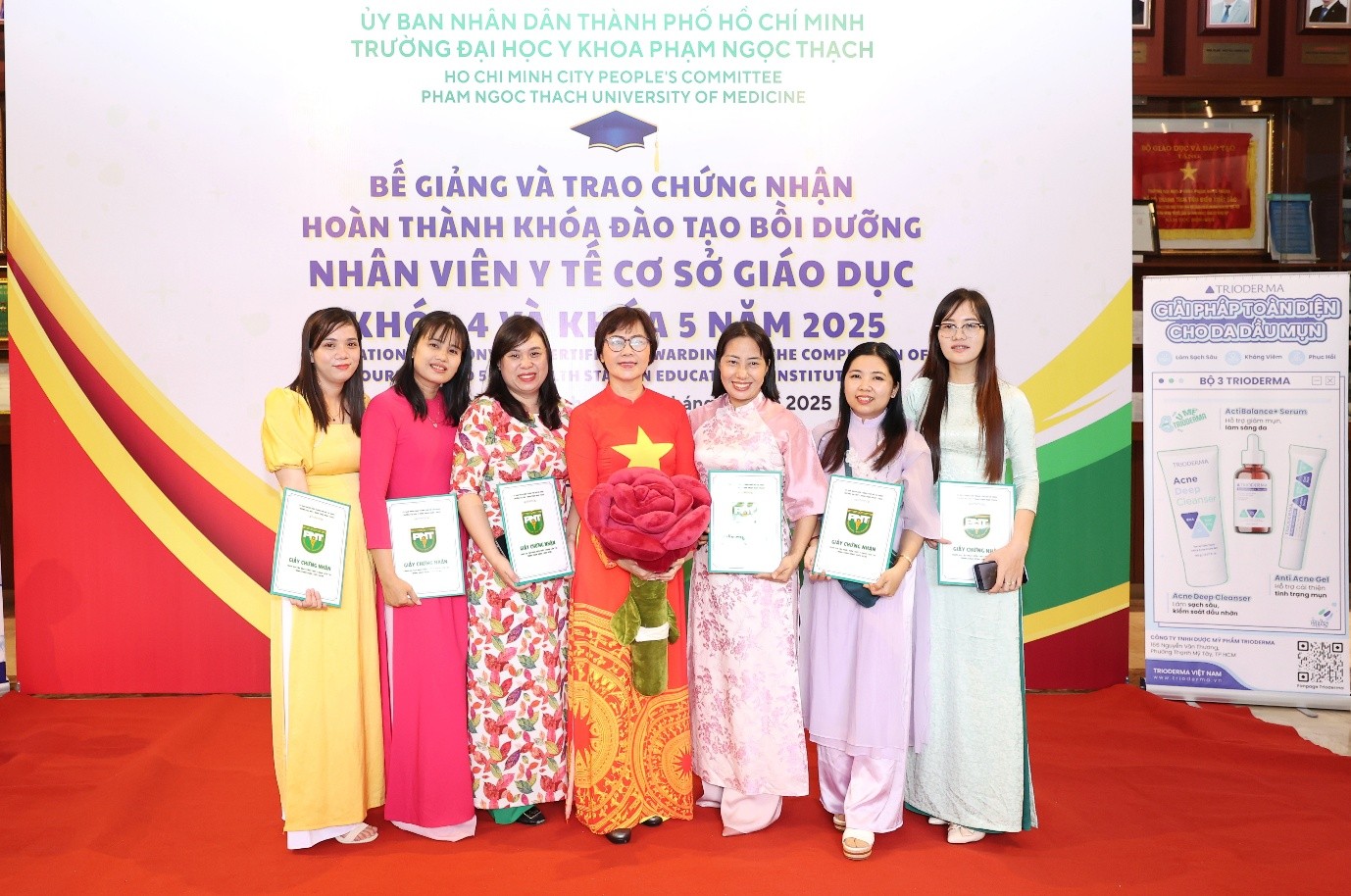 Các học viên được trao chứng nhận Khóa đào tạo bồi dưỡng nhân viên Y tế cơ sở giáo dục khóa 4 và khóa 5 năm 2025. (Ảnh: VPT cung cấp)