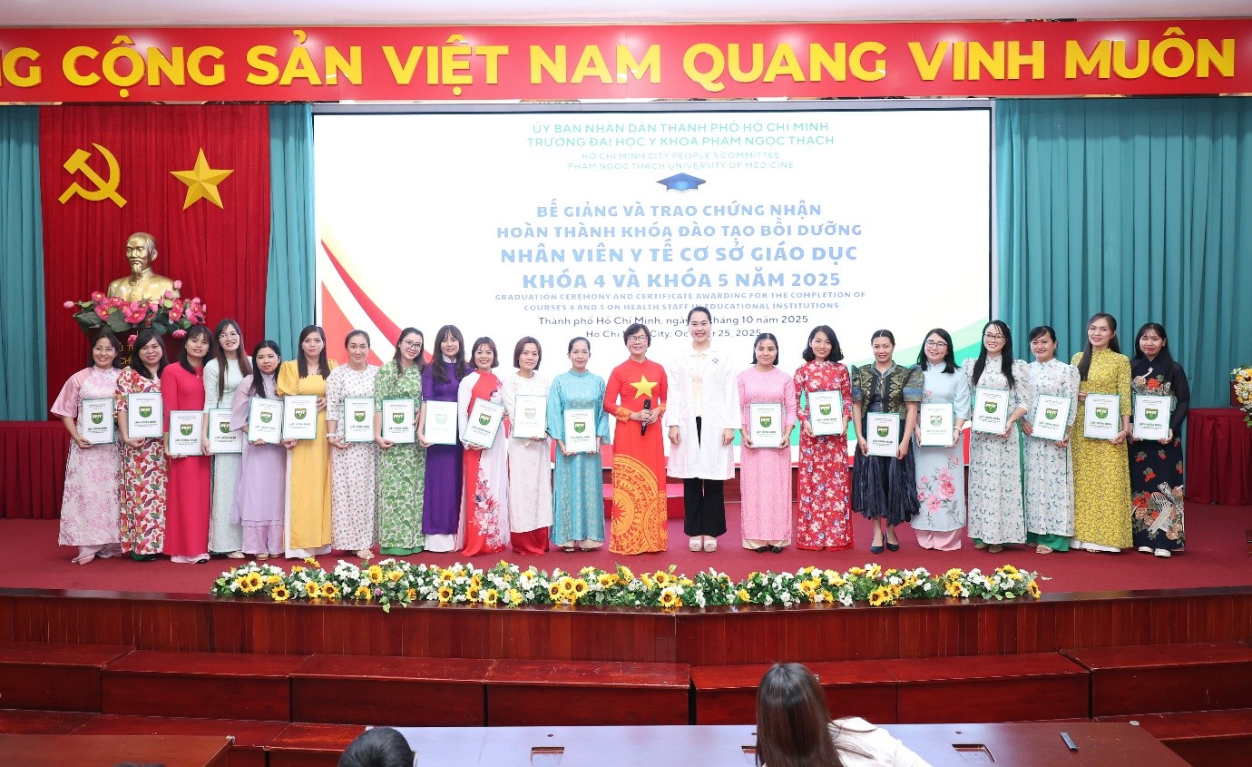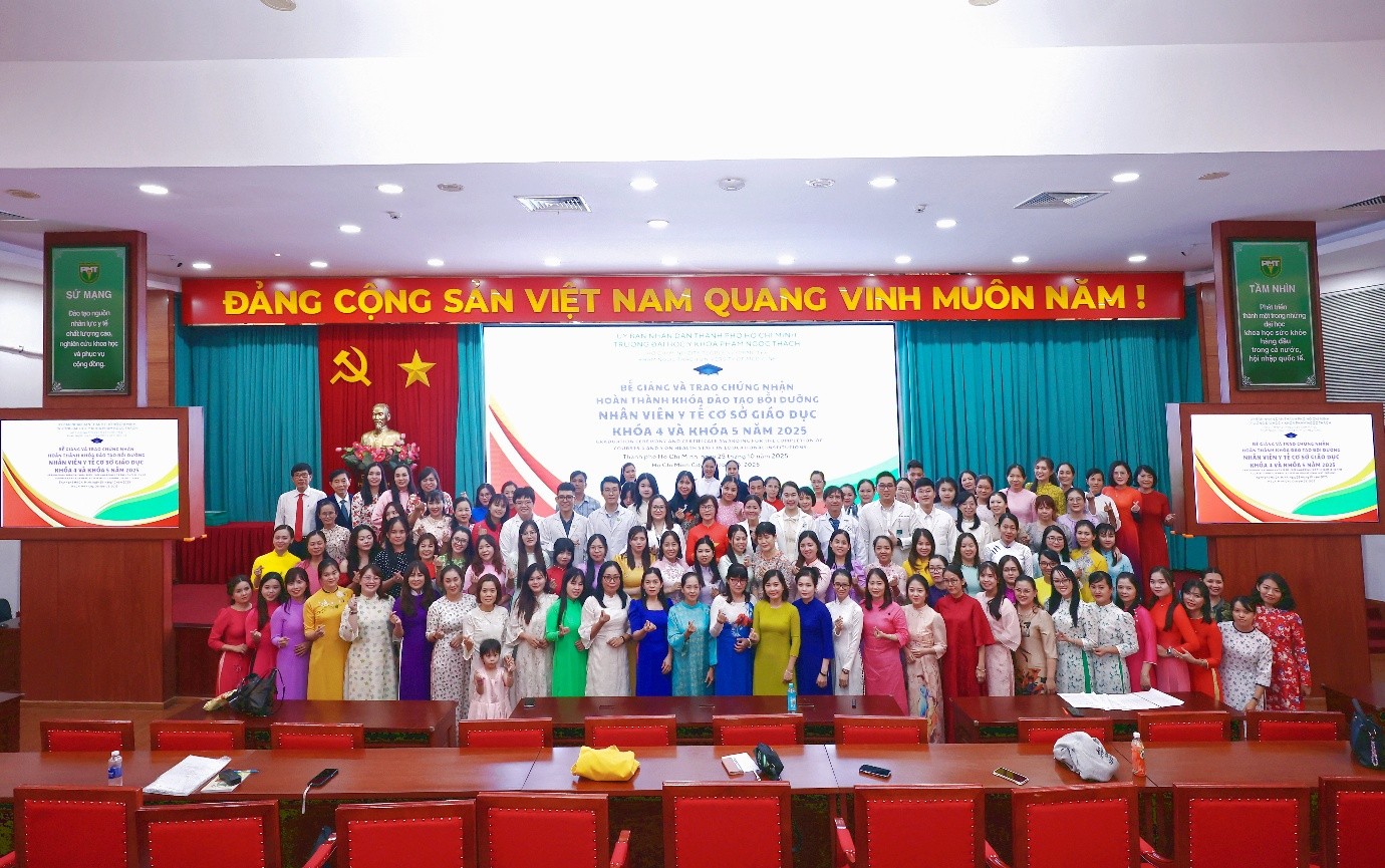 Giảng viên và Học viên Khóa đào tạo bồi dưỡng nhân viên Y tế cơ sở giáo dục khóa 4 và khóa 5 năm 2025 tại Trường Đại học Y khoa Phạm Ngọc Thạch chụp ảnh lưu niệm mừng ngày bế giảng và trao chứng nhận. (Ảnh: VPT cung cấp)