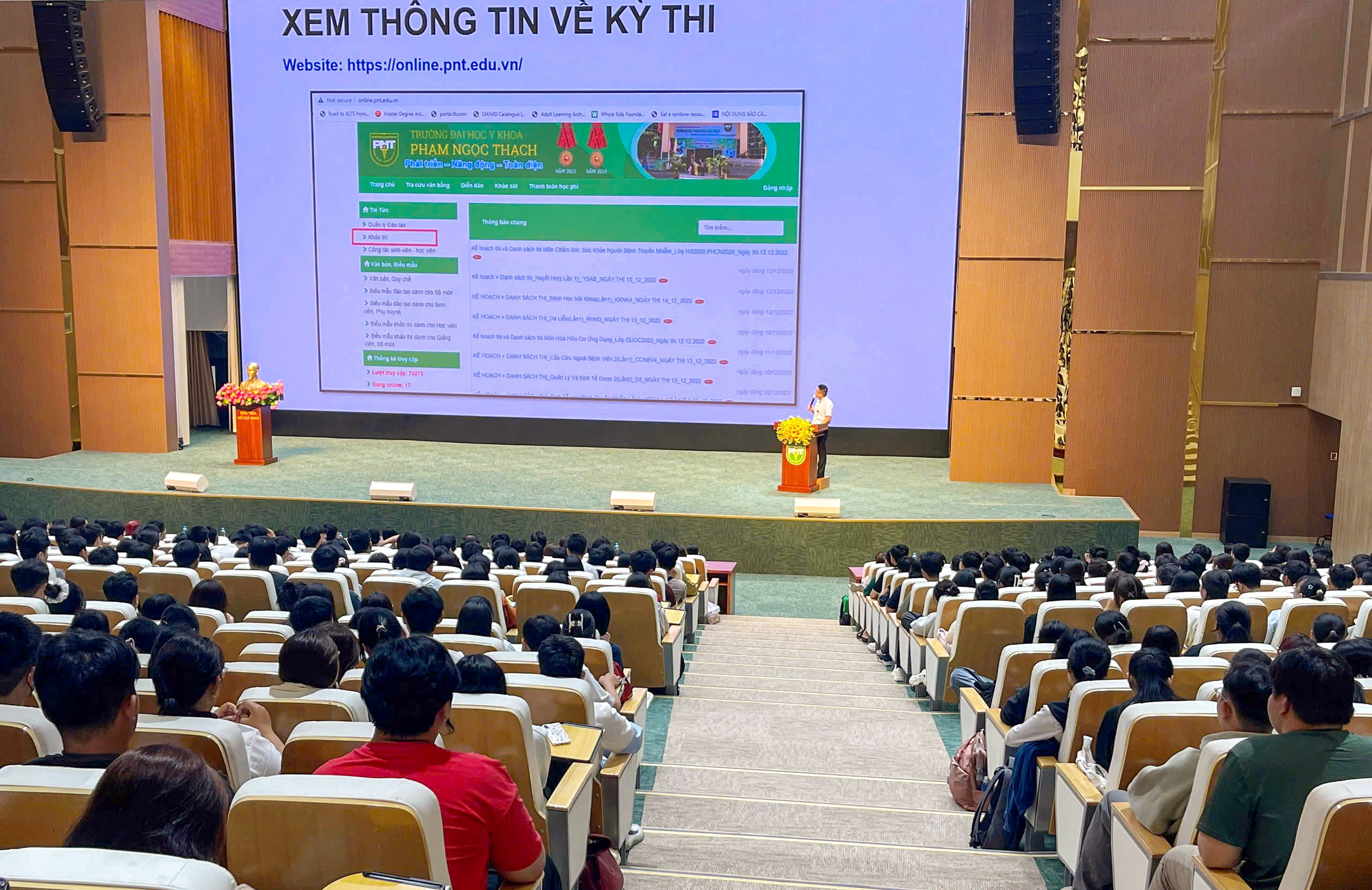 Ảnh 3. Đại diện phòng Khảo thí phổ biến các quy định và hướng dẫn tham gia hoạt động thi tại Trường Đại học Y khoa Phạm Ngọc Thạch.