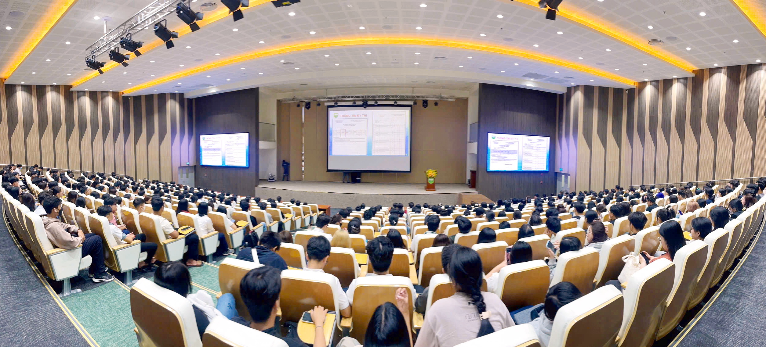Ảnh 1. Toàn cảnh buổi sinh hoạt công dân - sinh viên đầu khóa học tại giảng đường 1000 chỗ của trụ sở Tân Nhựt, Trường Đại học Y khoa Phạm Ngọc Thạch.