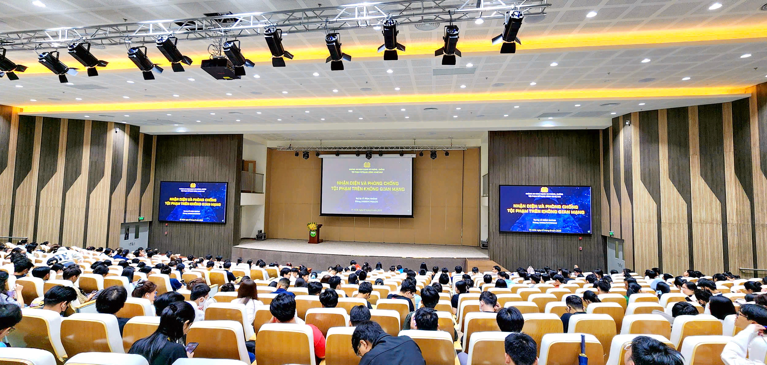 Ảnh 5,6. Đại úy Lê Ngọc Khánh - đại diện phòng ANM&PCTPSDCNC báo cáo chuyên đề “Nhận diện và phòng chống tội phạm trên không gian mạng” tại giảng đường 1000 chỗ và được truyền phát trực tiếp tại 02 giảng đường 500 chỗ.