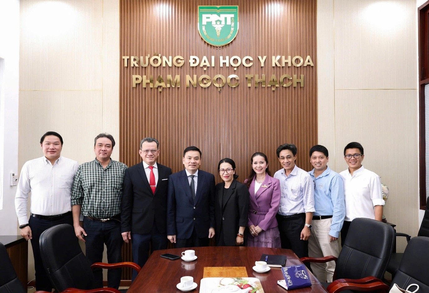 Ảnh 1: Buổi gặp mặt giữa Lãnh đạo Trường Đại học Y khoa Phạm Ngọc Thạch và đại diện Tập đoàn Y tế Phương Châu.