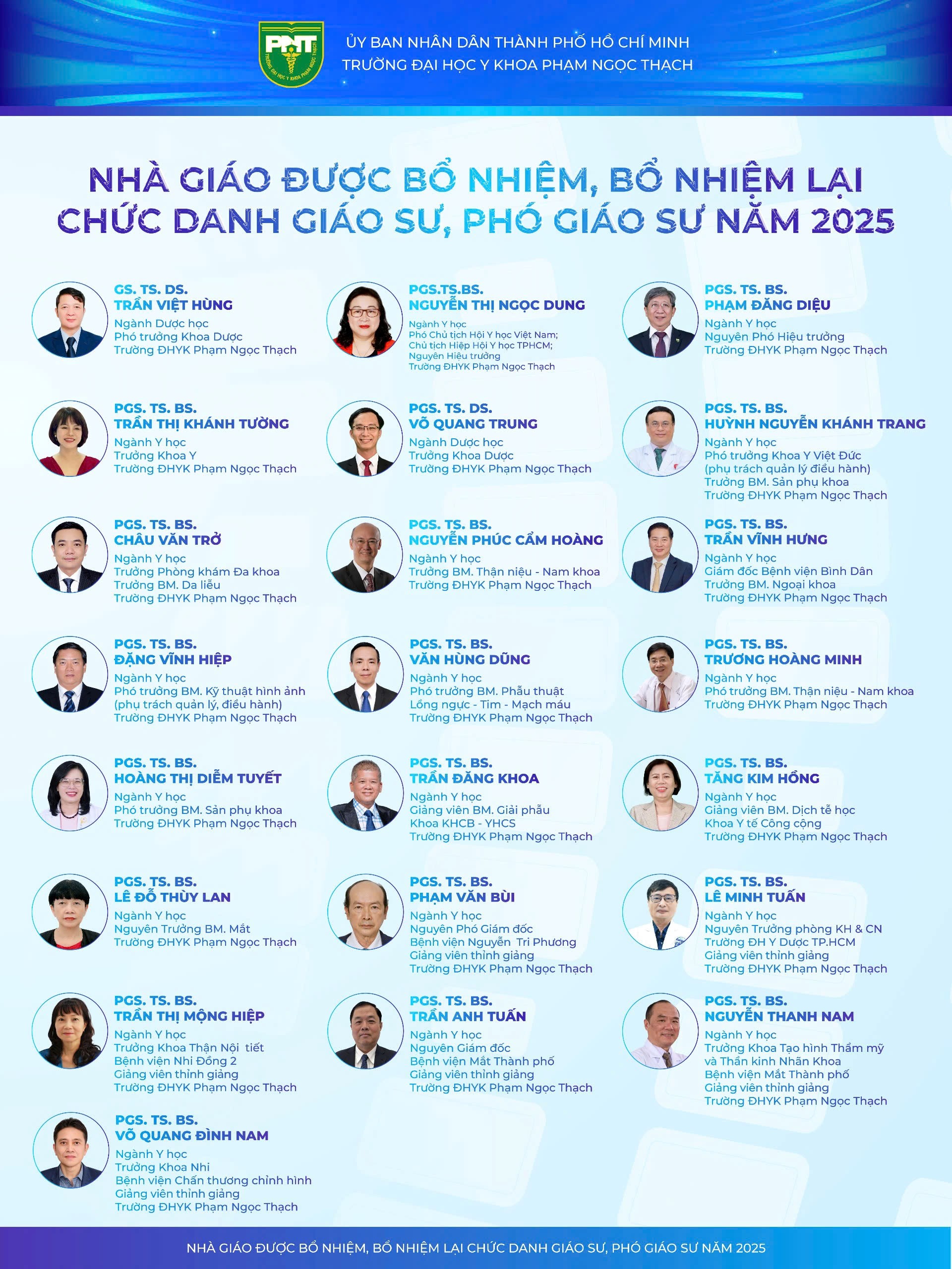 - PGS.TS.BS. Phạm Văn Bùi – Phó Giáo sư ngành Y học, Nguyên Phó Giám đốc BV. Nguyễn Tri Phương, giảng viên thỉnh giảng, PNTU.