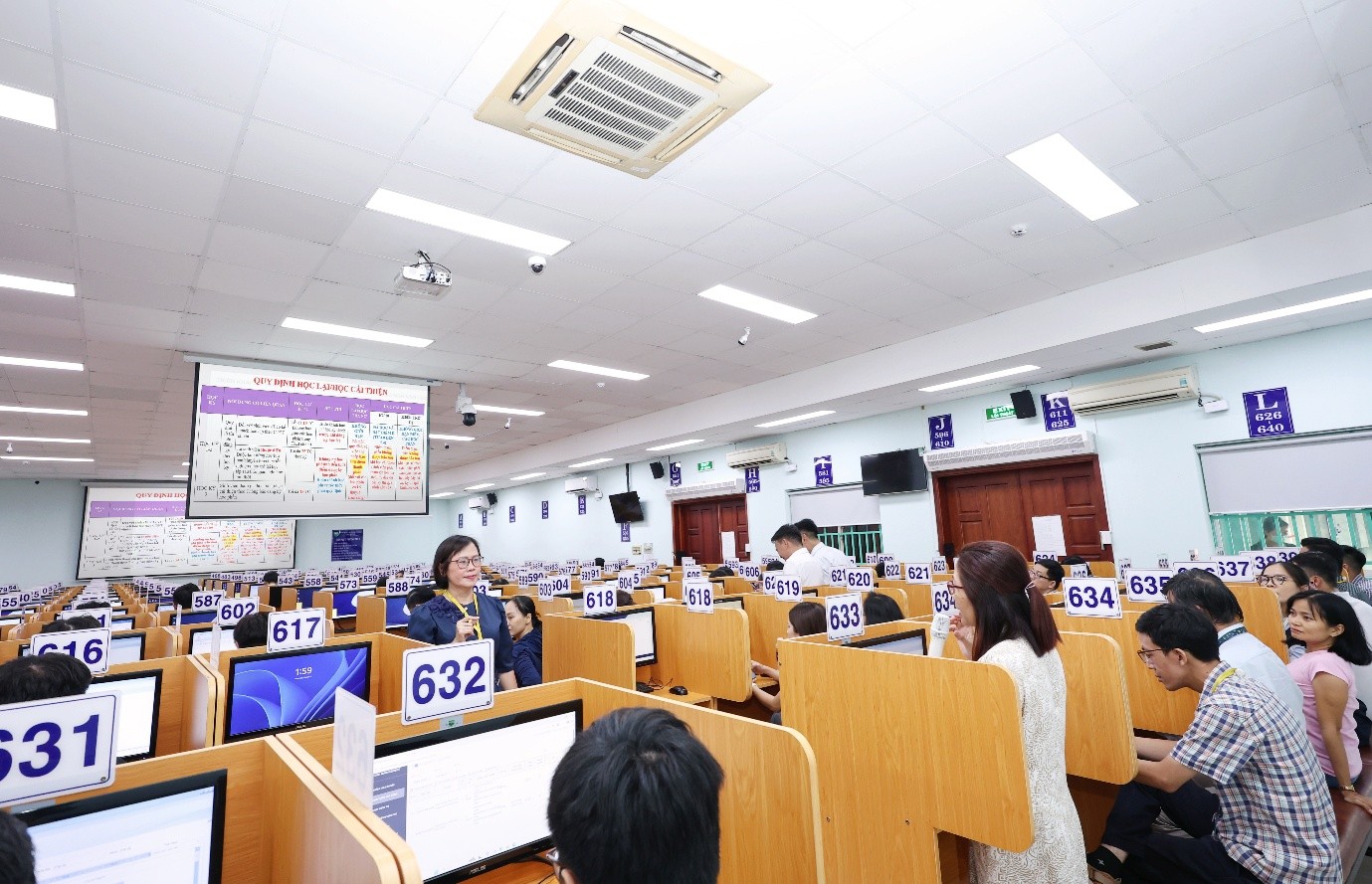 Buổi Tập huấn sử dụng phần mềm nhập điểm trực tiếp & trực tuyến được tổ chức tại Phòng máy tính - lầu 6 khu A2, Phòng Bảo đảm Chất lượng và Khảo thí. (Ảnh: VPT)