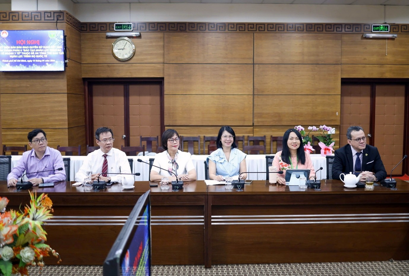 Lễ ký kết biên bản bàn giao quyền sử dụng kết quả đề án Thành phần 6 - Đào tạo nhân lực trình độ quốc tế ngành y tế theo Quyết định số 2426/QĐ-UBND ngày 05 tháng 7 năm 2021 của Ủy ban nhân dân Thành phố Hồ Chí Minh về phê duyệt Đề án tổng thể đào tạo nhân lực trình độ quốc tế (08 ngành: 1. Công nghệ thông tin - truyền thông; 2. Cơ khí - Tự động hóa; 3. Trí tuệ nhân tạo; 4. Quản trị doanh nghiệp; 5. Tài chính - Ngân hàng; 6. Y tế; 7. Du lịch; 8. Quản lý đô thị) giai đoạn 2020 - 2035 và Đại học chia sẻ (gọi tắt là Đề án tổng thể).