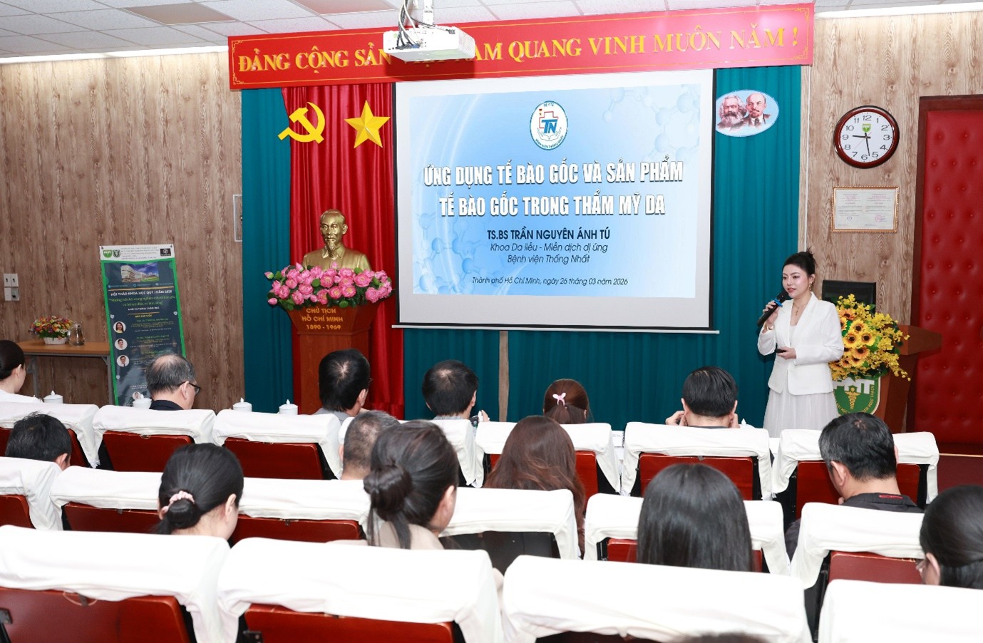 Ứng dụng thực chứng:Báo cáo của TS.BS. Trần Nguyên Ánh Tú mang đến góc nhìn lâm sàng sắc bén về ứng dụng tế bào gốc trong thẩm mỹ da, minh chứng cho việc chuyển hóa lý thuyết thành các phác đồ điều trị hiệu quả.