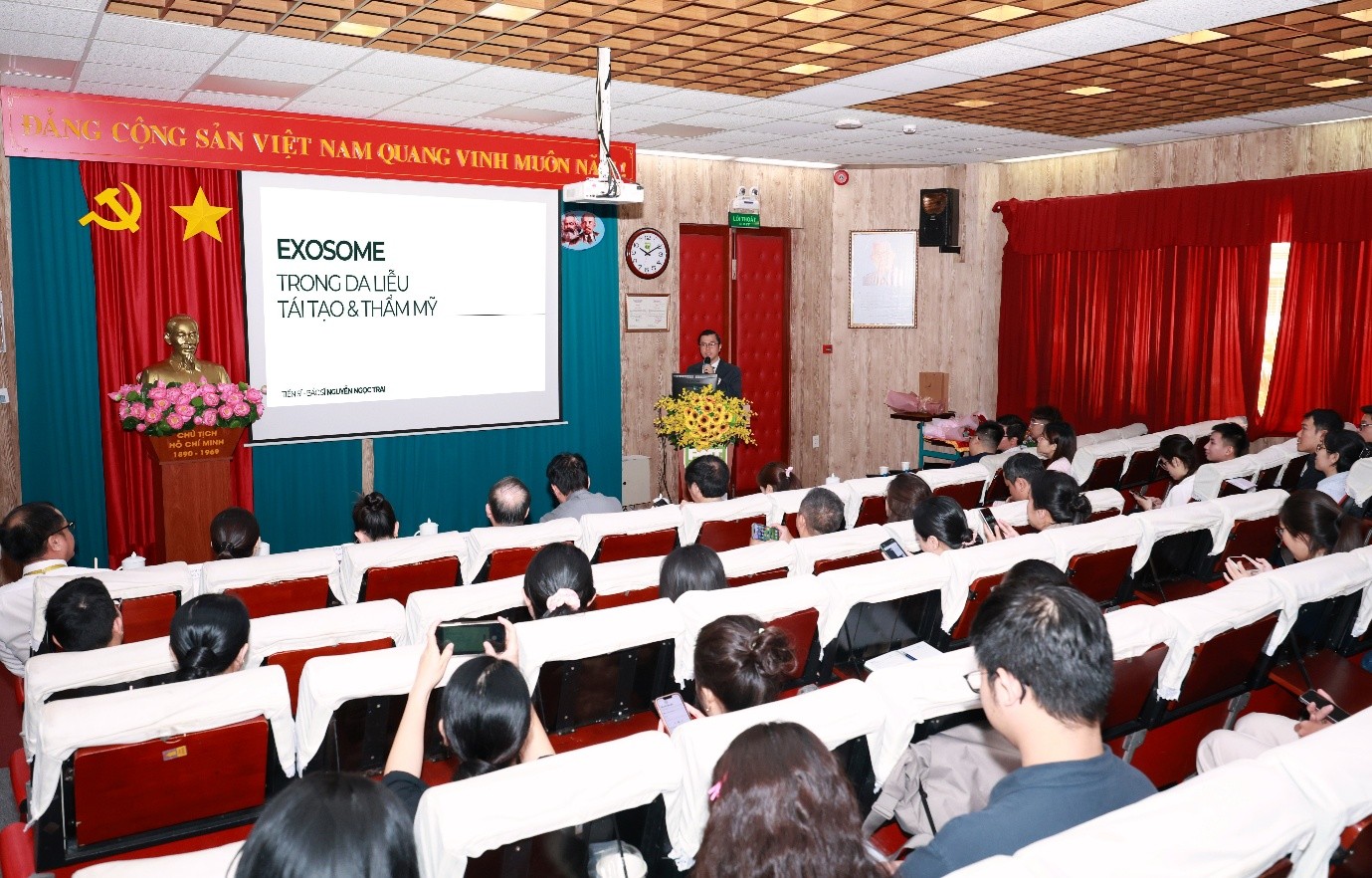 TS.BS. Nguyễn Ngọc Trai trình bày chủ đề: Exosome trong da liễu - tái tạo và thẩm mỹ. (Ảnh: VPT)