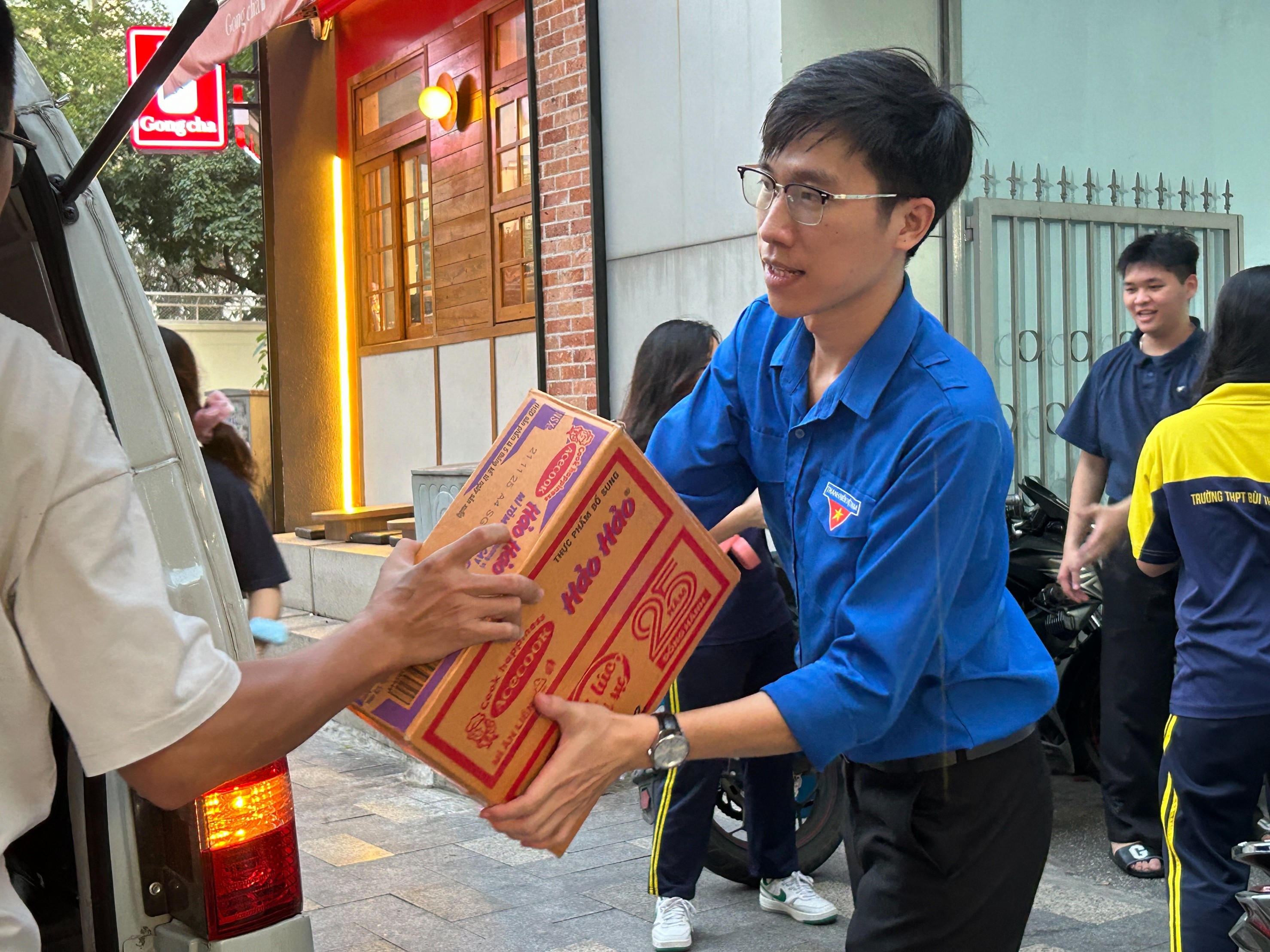 Đồng chí Nguyễn Minh Tài, Phó Bí thư Đoàn Thanh niên Trường cùng vận chuyển nhu yếu phẩm hỗ trợ đồng bào vùng lũ. (Ảnh: ĐTN cung cấp)