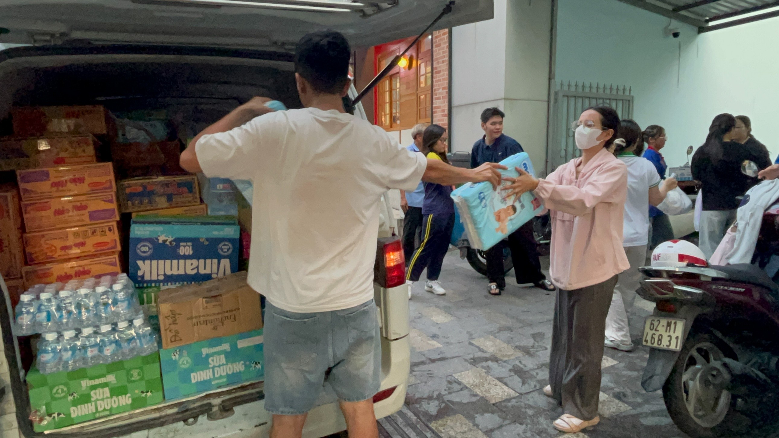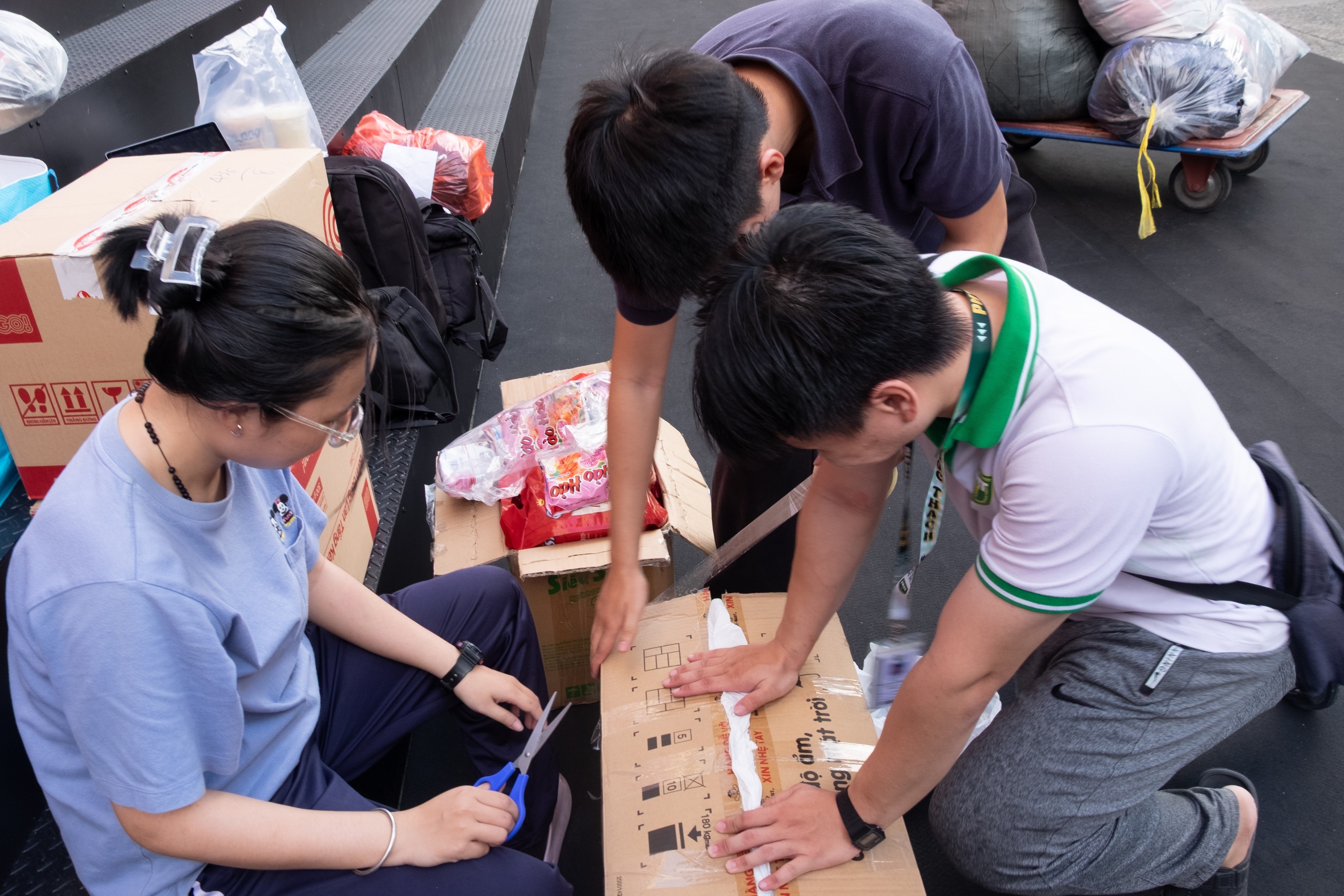 Các bạn Sinh viên Trường Đại học Y khoa Phạm Ngọc Thạch chung tay đóng gói, vận chuyển nhu yếu phẩm đến đồng bào vùng lũ. (Ảnh: ĐTN cung cấp)
