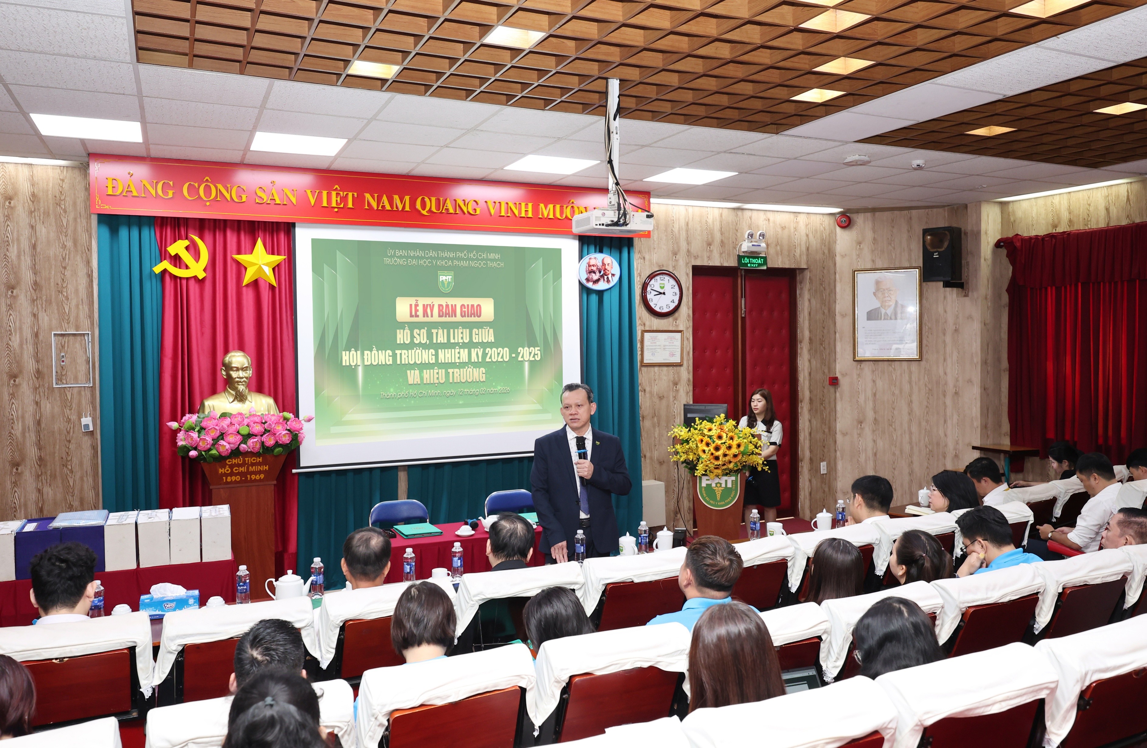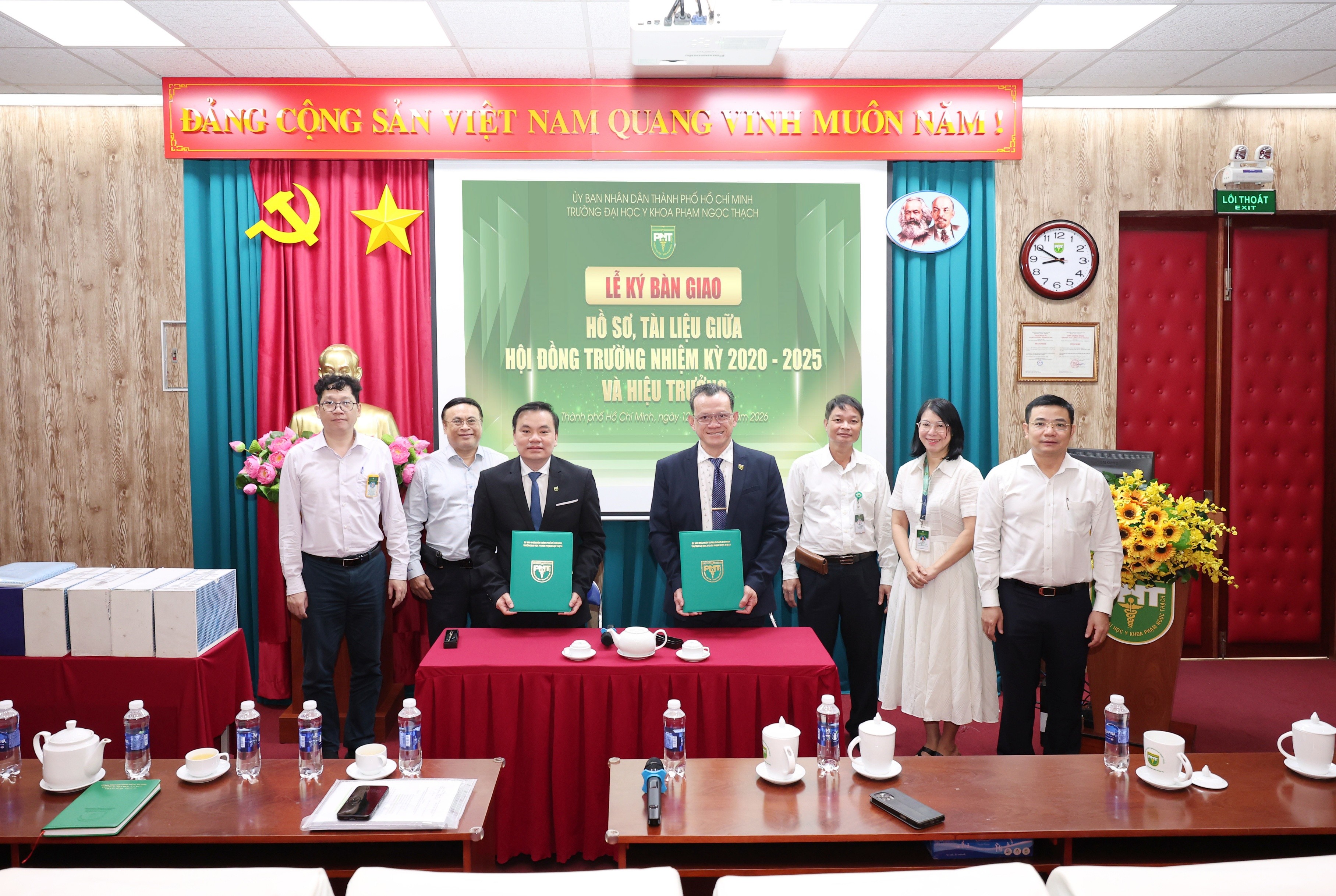 Lễ ký kết Bàn giao Hồ sơ, Tài liệu giữa Hội đồng Trường nhiệm kỳ 2020-2025 và Hiệu trưởng. (Ảnh: VPT)