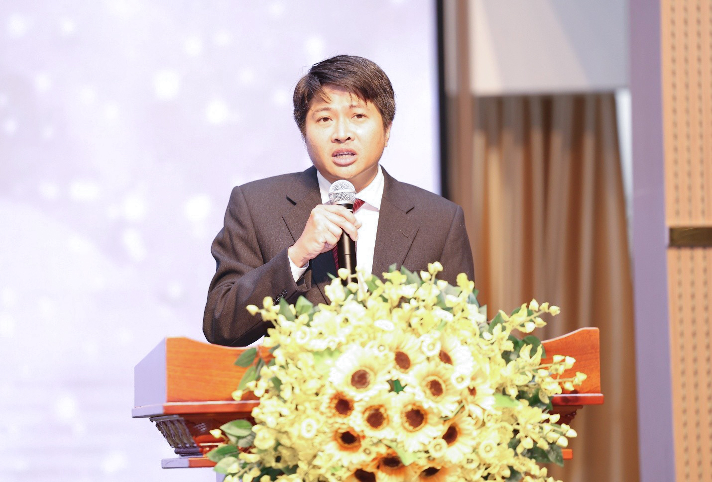 ThS.BSCKII Nguyễn Đức Trung - Phó Giám đốc Bệnh viện An Bình, tân nghiên cứu sinh ngành Ngoại Khoa đại diện học viên Sau Đại học phát biểu tại buổi lễ. (Ảnh VPT cung cấp)