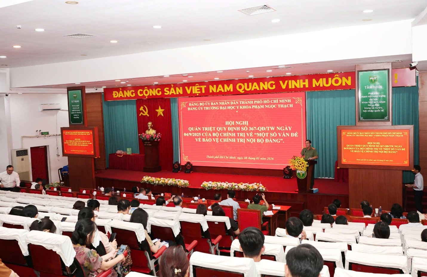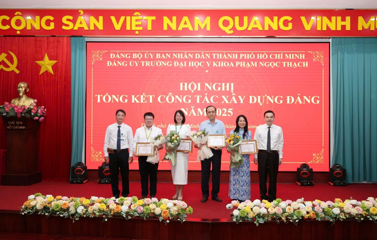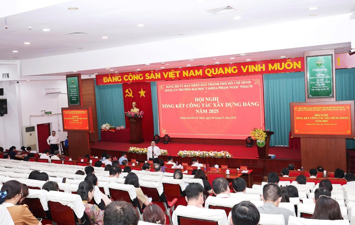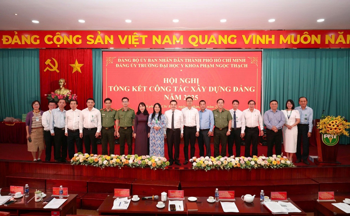 Đại biểu đại diện các cấp lãnh đạo chụp ảnh lưu niệm tại Hội nghị tổng kết công tác xây dựng Đảng năm 2025 Trường Đại học Y khoa Phạm Ngọc Thạch. (Ảnh: VPT cung cấp)