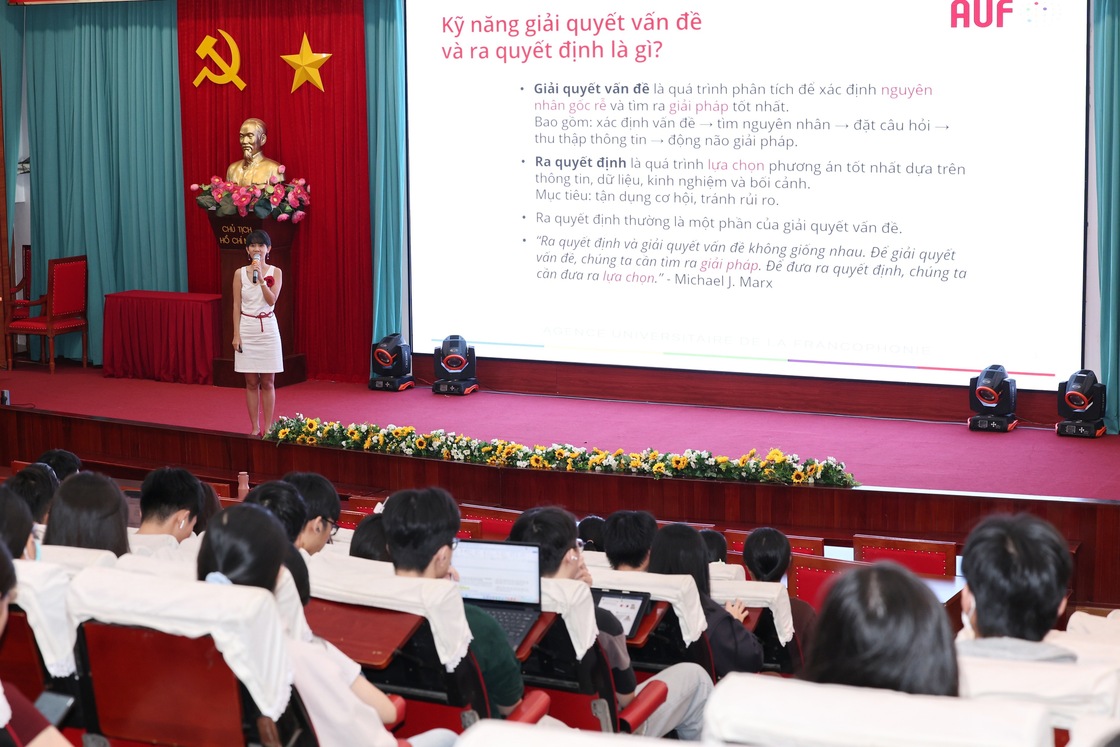 ThS. Nguyễn Phước Huyền Anh - Đại diện Tổ chức Đại học Pháp ngữ chia sẻ, hướng dẫn kỹ năng giải quyết vấn đề và ra quyết định. (Ảnh: VPT cung cấp)
