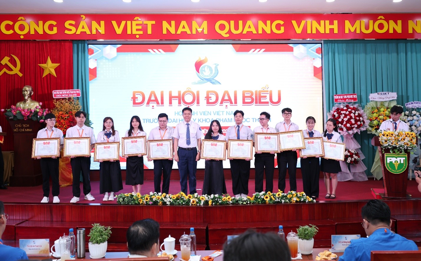 PGS.TS.BS. Nguyễn Trọng Hào - Bí thư Đảng ủy, Chủ tịch Hội đồng; PGS.TS.DS. Nguyễn Đăng Thoại - Phó Hiệu trưởng phụ trách quản lý, điều hành; Đ/c Nguyễn Đăng Khoa - Phó Bí thư, Chủ nhiệm Ủy ban Kiểm tra Thành đoàn, Chủ tịch Hội Sinh viên Việt Nam TP.HCM và các đồng chí Công Đoàn Trường, Phòng Công tác Sinh viên, Đoàn Thanh niên - Hội Sinh viên tham dự Đại hội. (Ảnh VPT cung cấp)