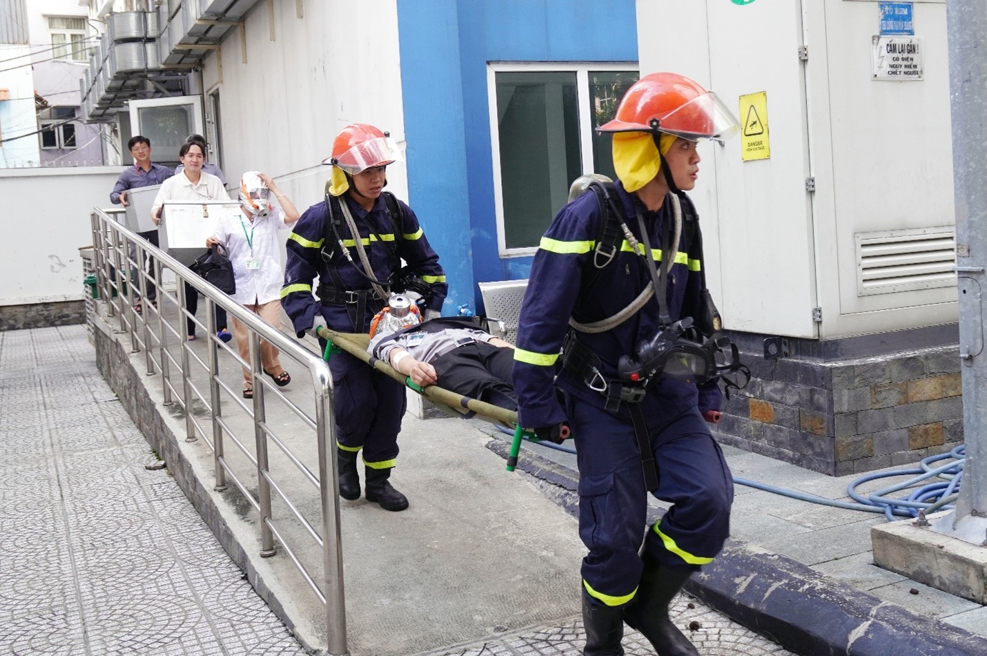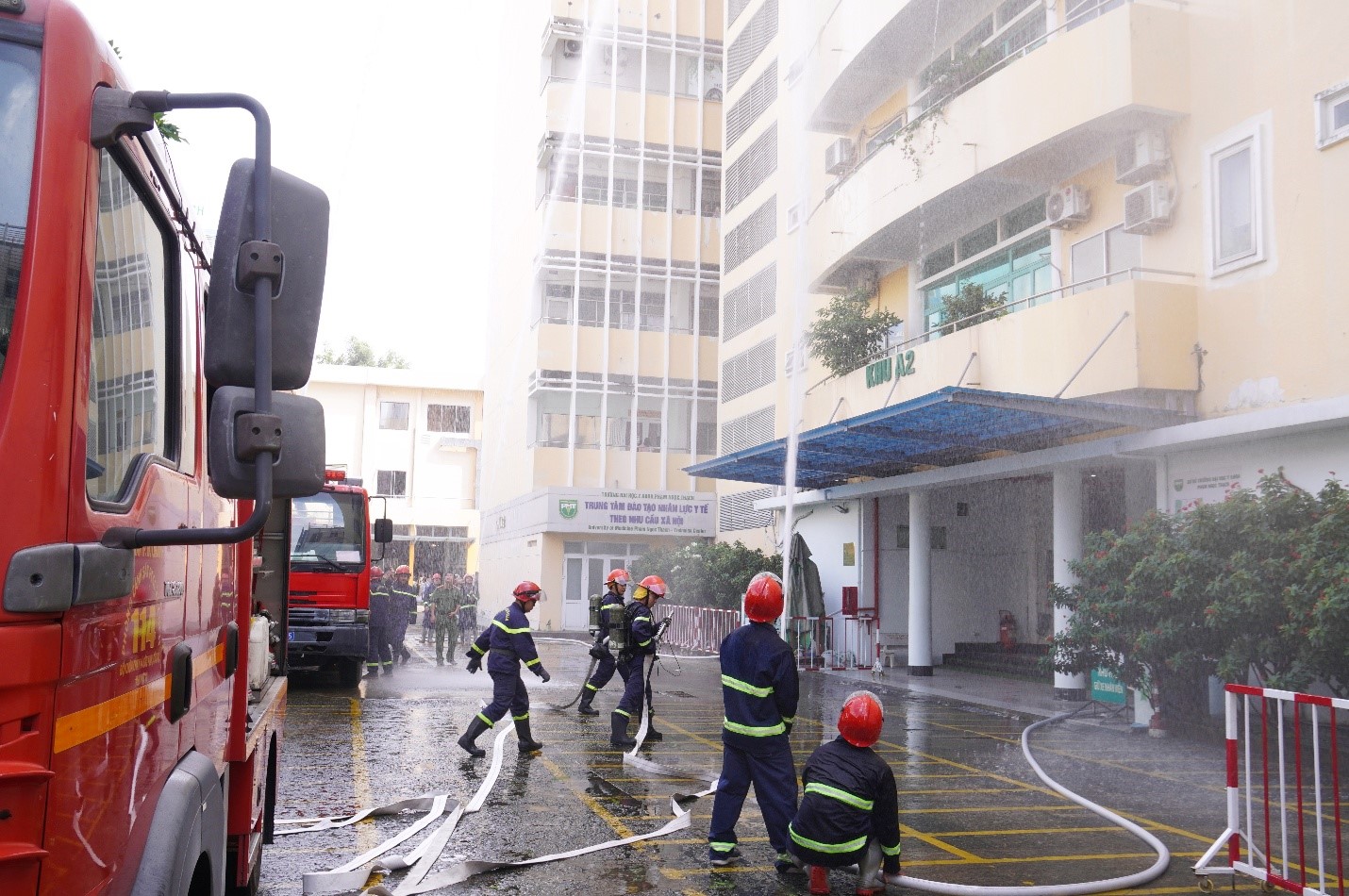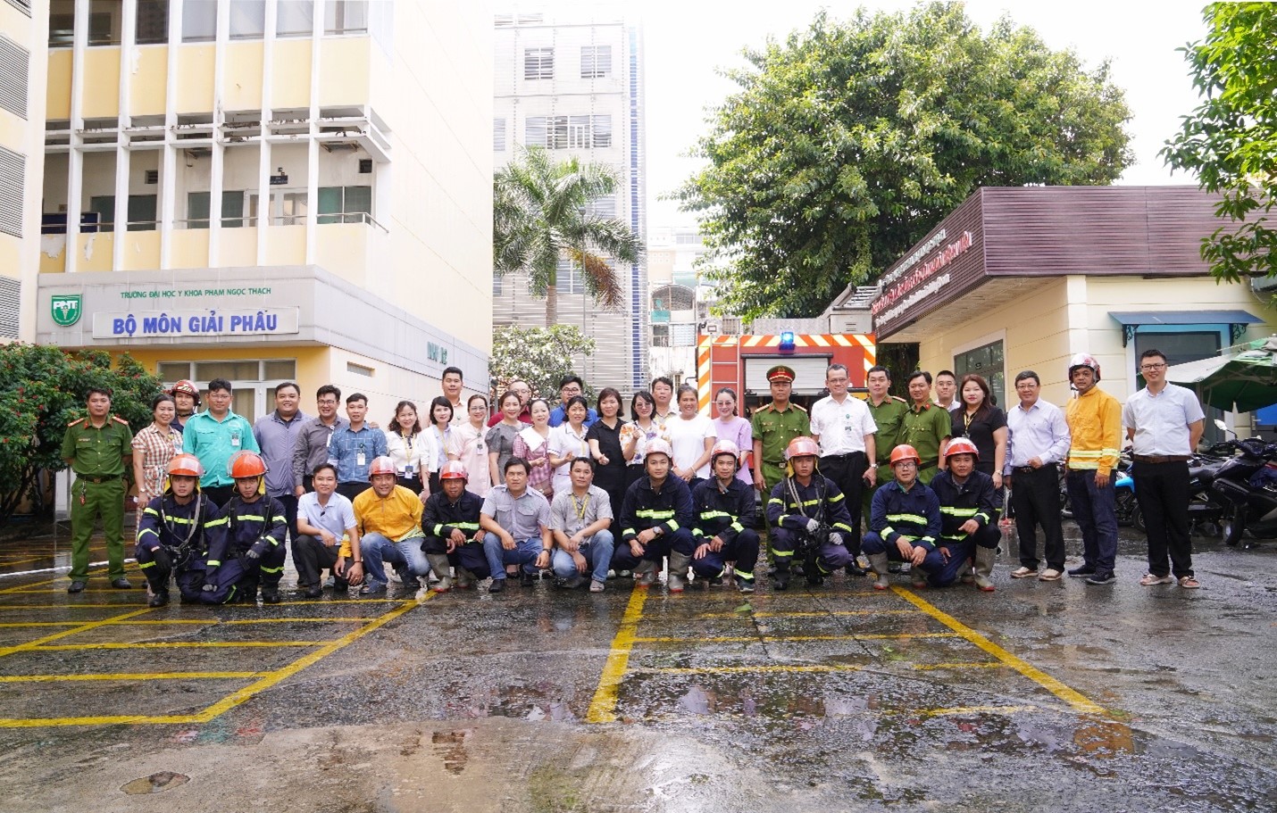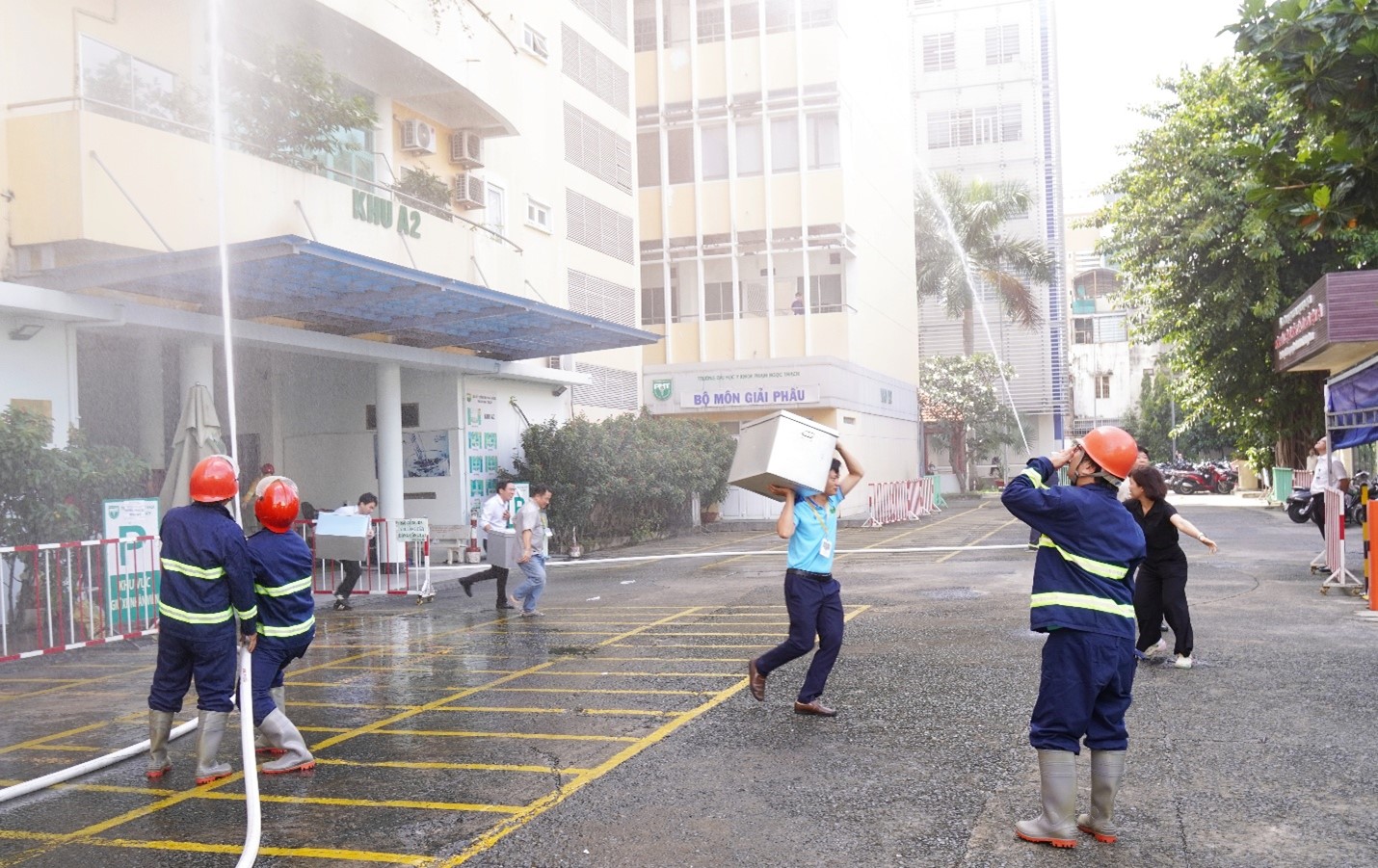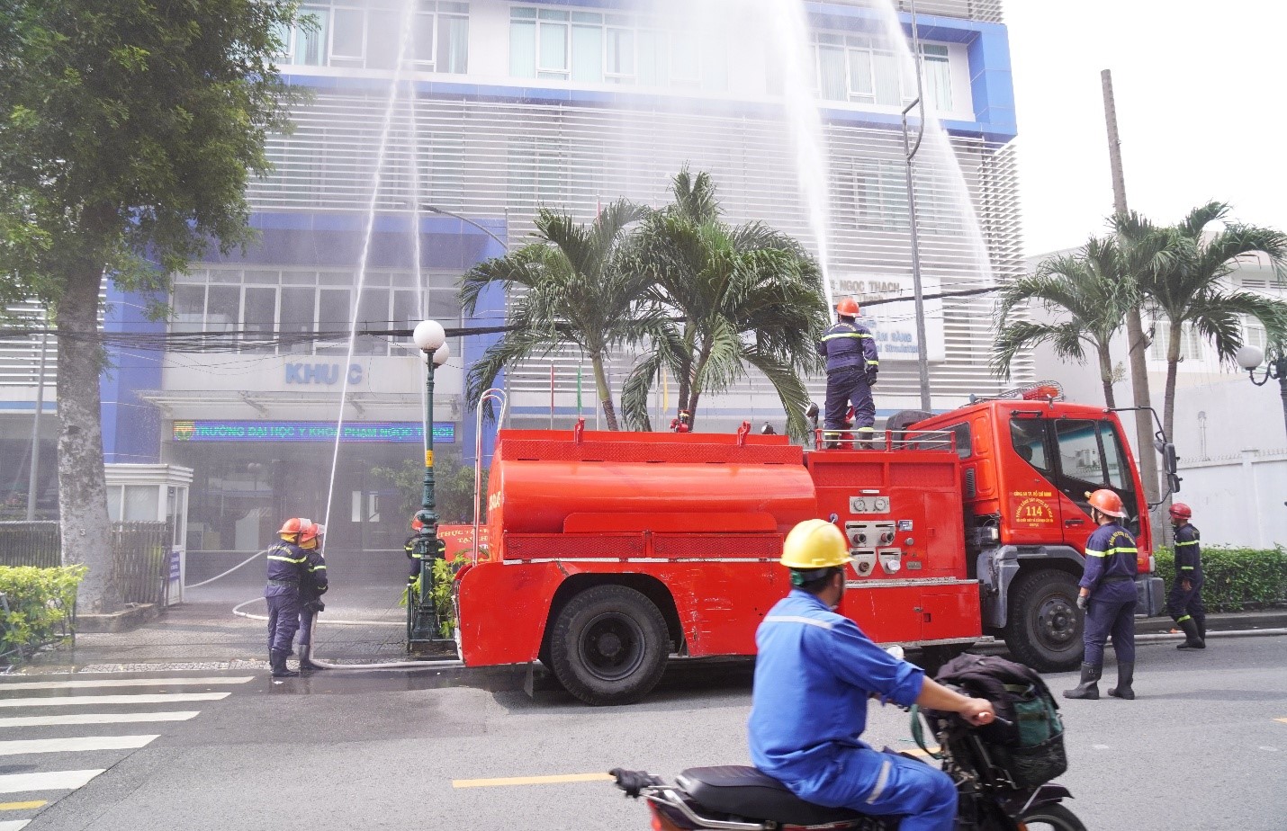 Ảnh 1: Trường Đại học Y khoa Phạm Ngọc thạch định kỳ tổ chức tập huấn và thực hành phương án chữa cháy và cứu nạn, cứu hộ tại Khu A2 và Khu C cho viên chức, người lao động nhà trường năm 2025.