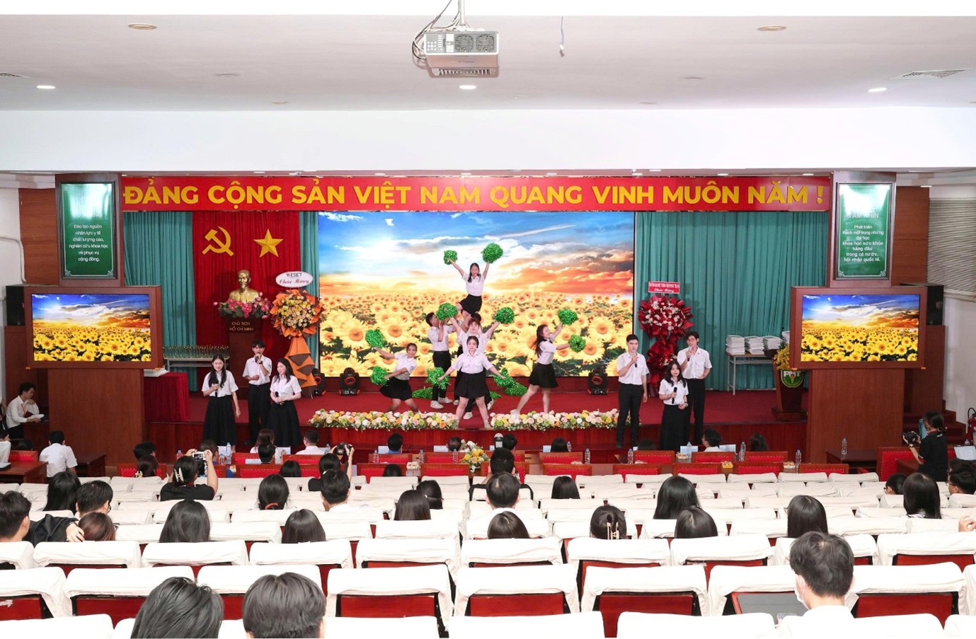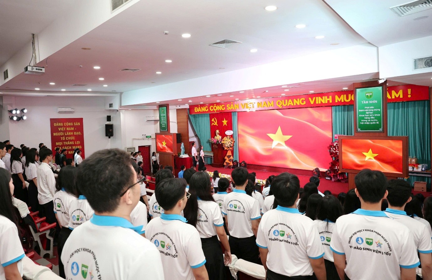 Chương trình vinh dự đón tiếp ThS. Nguyễn Ngọc Hà - Phụ trách điều hành Phòng Công tác sinh viên; Đ/c Nguyễn Hữu Mai Thư - Ủy viên Ban Thư ký, Chánh Văn phòng Hội Sinh viên TP.HCM; Đ/c Phạm Hoàng Tấn Lộc - Chủ tịch Hội Sinh viên Học viện Hành chính Quốc gia, Phân hiệu tại TP.HCM; Đ/c Hà Thanh Đạt - Đảng ủy viên, Bí thư Đoàn Trường; Đ/c Lê Đặng Quốc Thái - Phó Bí thư Đoàn Trường; Đ/c Huỳnh Hoàng Tú - Ủy viên Ban Thường vụ Đoàn Trường, Chủ tịch Hội Sinh viên Trường; Đ/c Ngô Lê Như Bảo - Ủy viên Ban Thường vụ Đoàn Trường, Phó Chủ tịch Hội Sinh viên Trường; Đ/c Nguyễn Ngọc Trâm Anh - Phó Chủ tịch Hội Sinh viên Trường; cùng các đồng chí nguyên Thường trực Hội Sinh viên Trường qua các thời kỳ, đại diện Ban Chấp hành, Ban Kiểm tra, cán bộ chủ chốt cơ sở Đoàn - Hội, CLB - Đội - Nhóm, các Sinh viên 5 Tốt cấp Trường, cán bộ Hội tiêu biểu, quý phụ huynh và đông đảo sinh viên Trường Đại học Y khoa Phạm Ngọc Thạch.