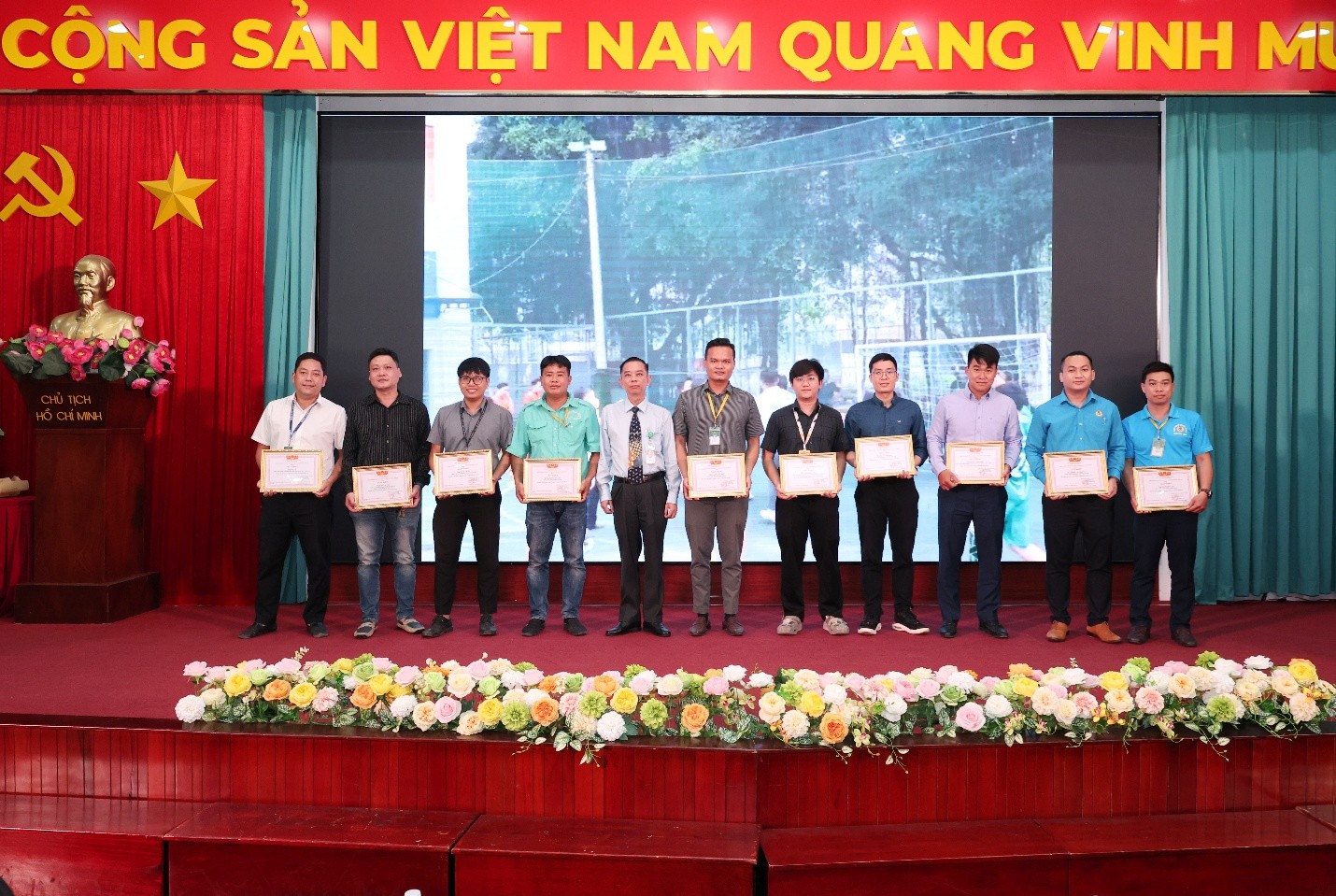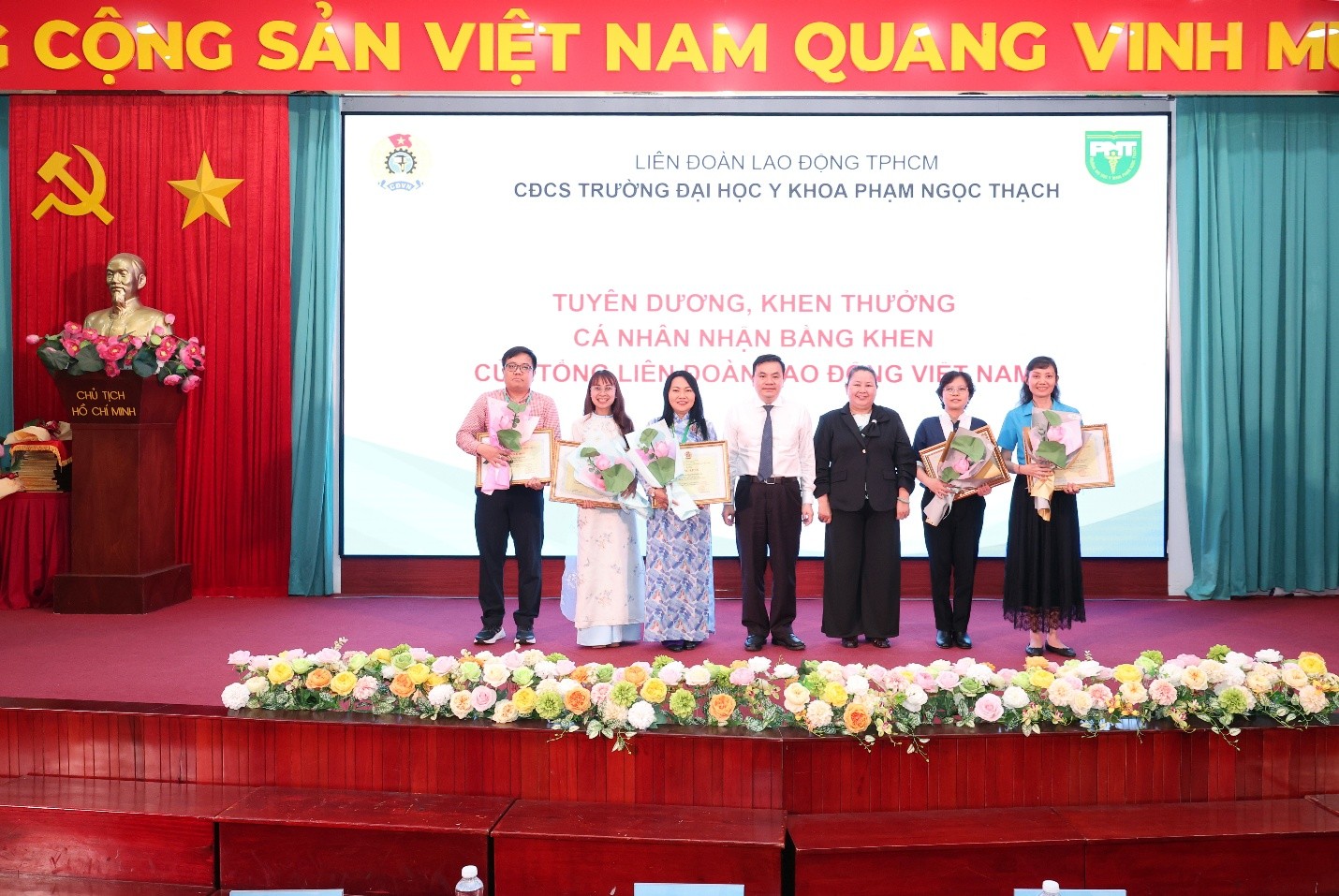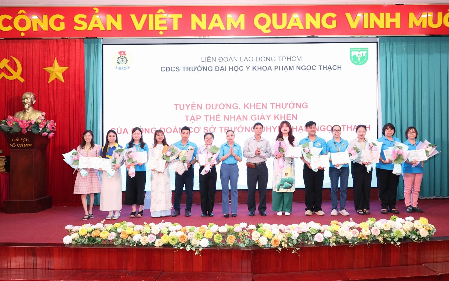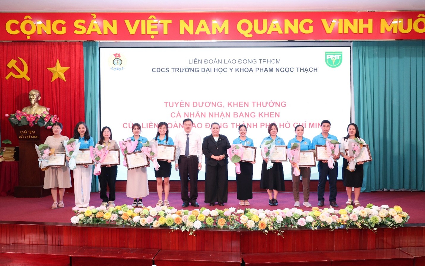 Lãnh đạo LĐLĐ TPHCM và nhà trường trao bằng khen của Tổng LĐLĐ Việt Nam cho các Tập thể, cá nhân có thành tích xuất sắc. (Ảnh: VPT)