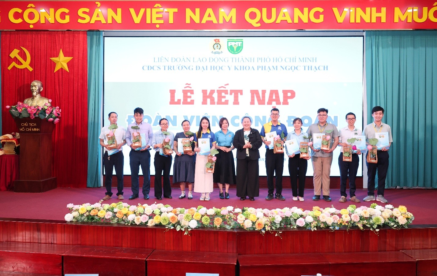 Bà Lê Thị Kim Thúy, Phó Chủ tịch LĐLĐ TPHCM, trao quyết định kết nạp cho đoàn viên mới - Công đoàn cơ sở Trường Đại học Y khoa Phạm Ngọc Thạch. (Ảnh: VPT)