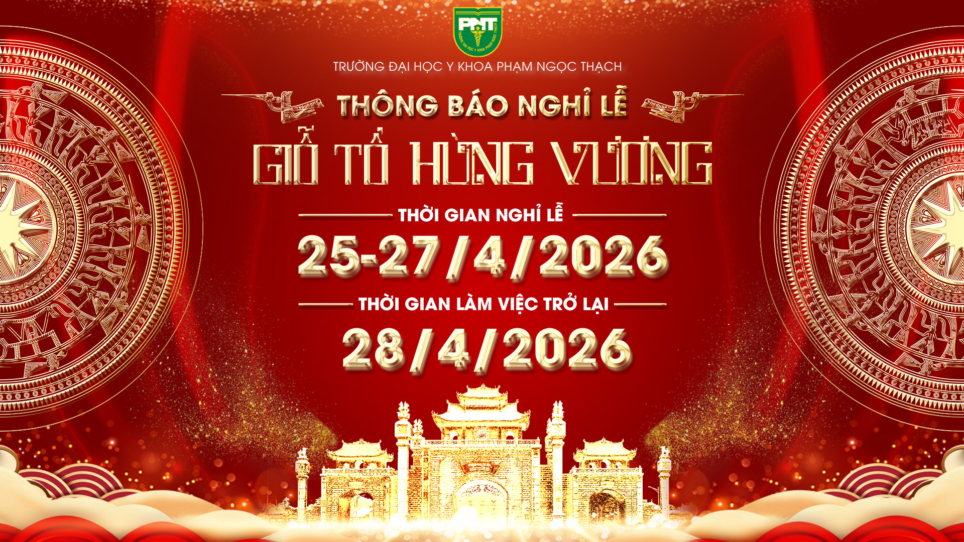 Trường Đại học Y khoa Phạm Ngọc Thạch thông báo nghỉ lễ Giỗ Tổ Hùng Vương mùng mười tháng Ba (Âm lịch). (Ảnh: VPT)