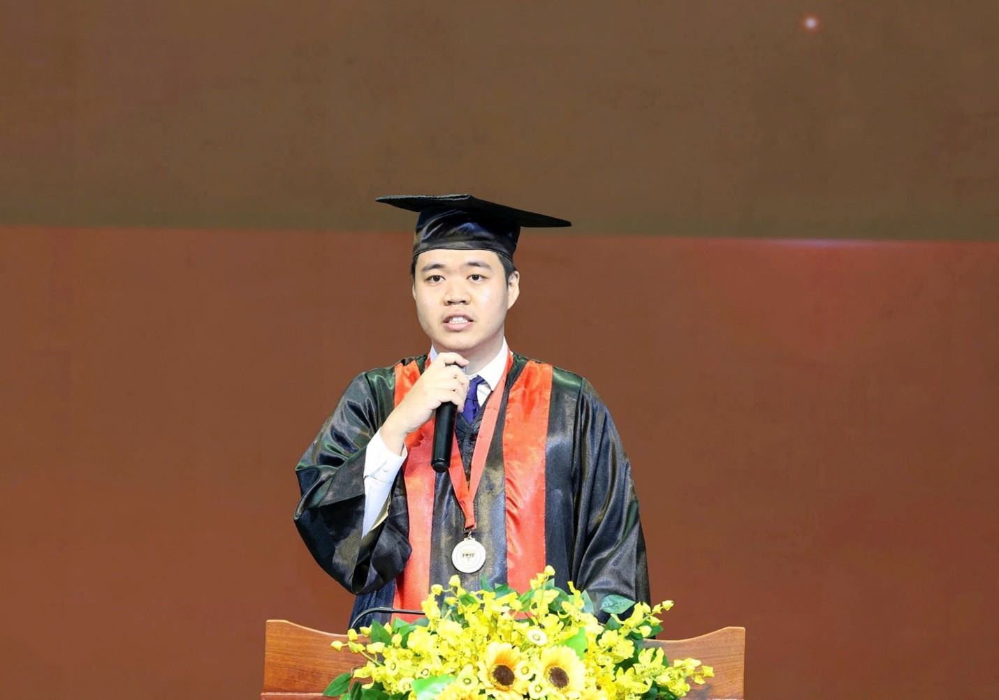 BS. Trần Nguyễn Nhất Tín - Thủ khoa Bác sĩ Y khoa phát biểu trong Lễ Tốt nghiệp Đại học năm 2025 tại Trường Đại học Y khoa Phạm Ngọc Thạch. (Ảnh: VPT)