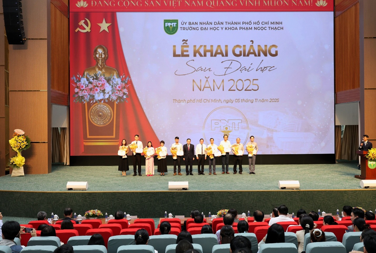 BS. Trần Nguyễn Nhất Tín nhận bằng Thủ khoa Tốt nghiệp Đại học năm 2025 và nhận bằng khen, hoa chúc mừng Thủ khoa Bác sĩ nội trú 2025 - Bộ môn Nội Tổng quát, Trường Đại học Y khoa Phạm Ngọc Thạch. (Ảnh: VPT)