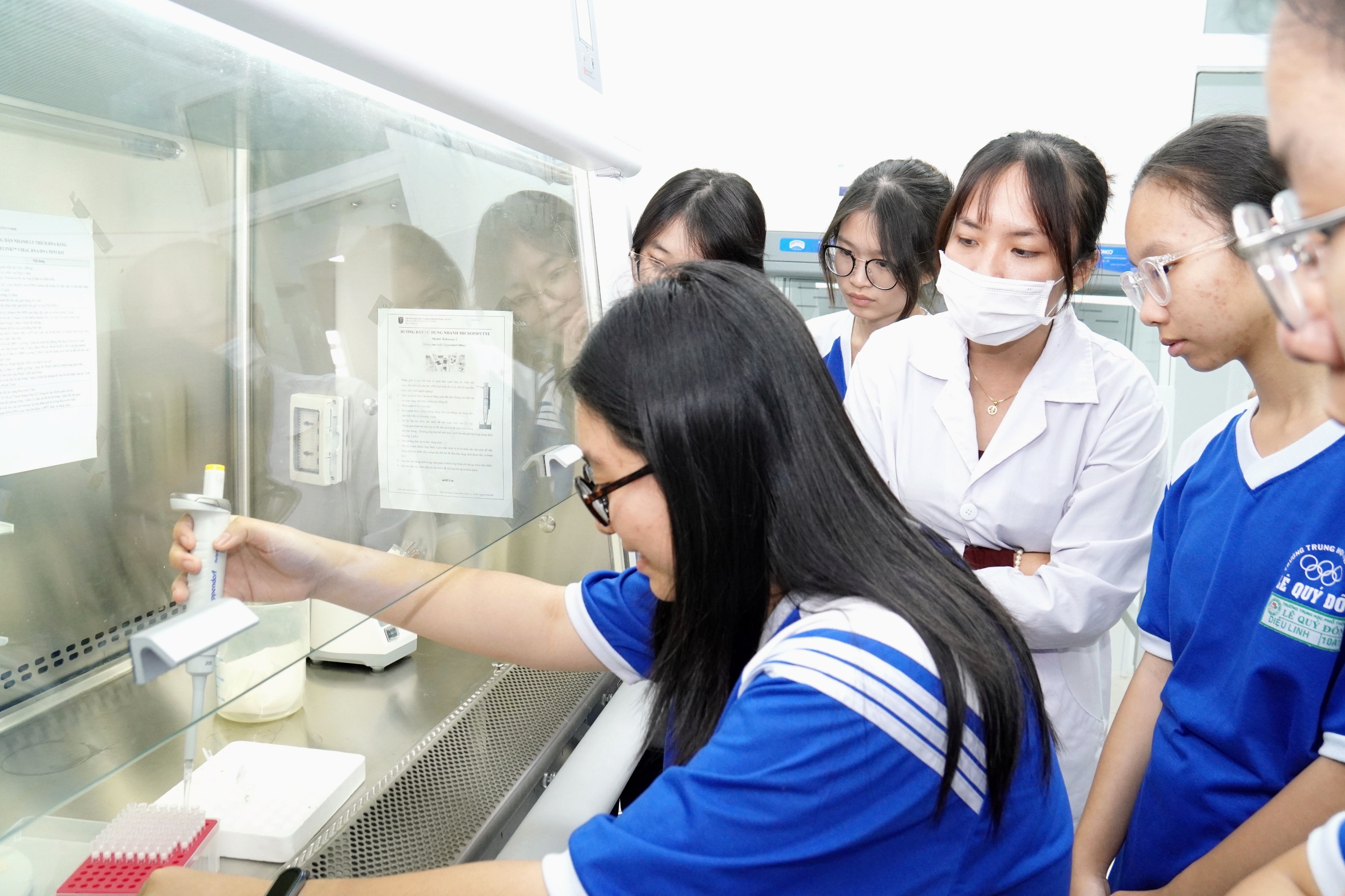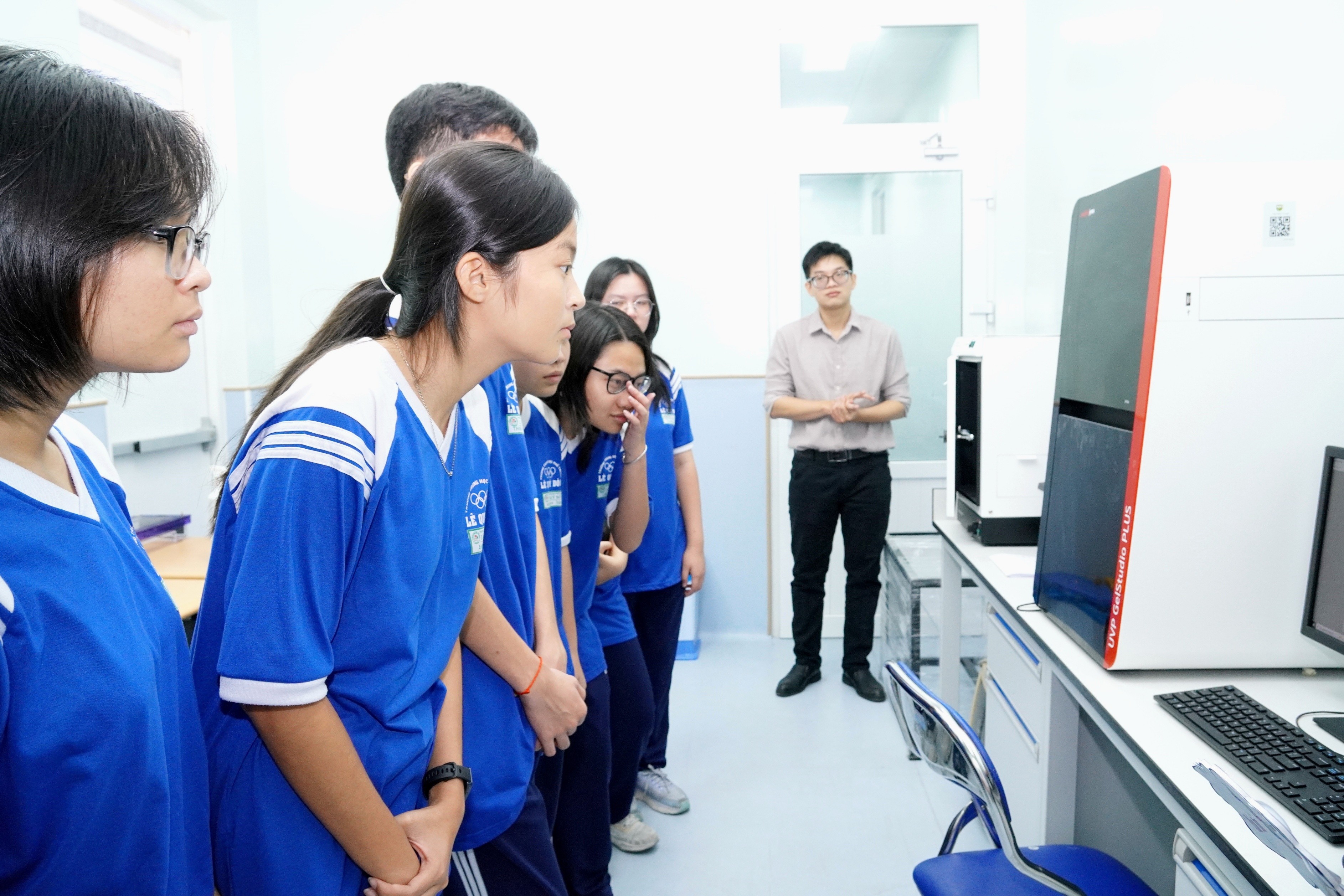 Các em Học sinh khối 10 Trường THPT Lê Quý Đôn TP. HCM tham quan, trải nghiệm tại Trung tâm Xét nghiệm và Nghiên cứu Y sinh chương trình "Open Campus 2025" (Ảnh: VPT cung cấp)