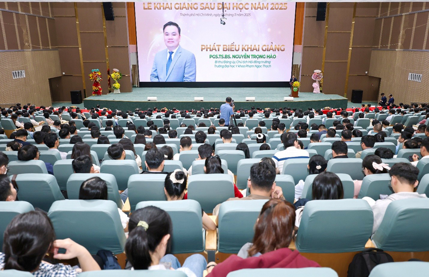Quý đại biểu, Lãnh đạo Trường, Quý thầy cô cùng tân học viên tham dự buổi Lễ Khai giảng Sau Đại học năm học 2025-2026 tại Trụ sở Tân Nhựt - Trường Đại học Y khoa Phạm Ngọc Thạch. (Ảnh VPT cung cấp)