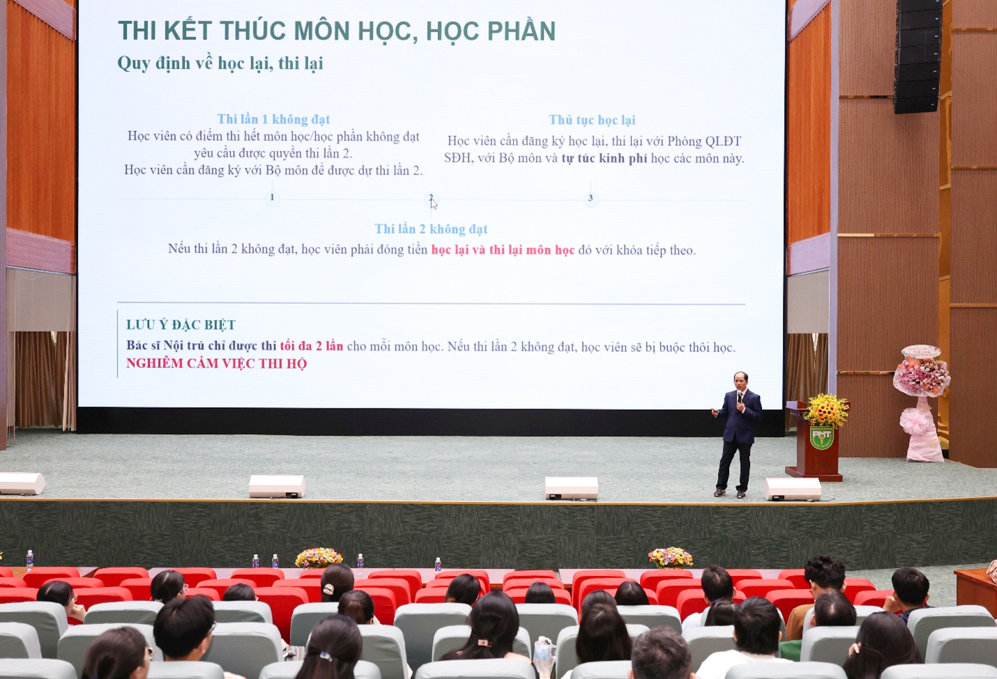 ThS.BS.CKII Phan Duy Quang - Phòng Quản lý Đào tạo Sau Đại học phổ biến chương trình sinh hoạt đầu khóa năm học 2025-2026 cuối buổi lễ. (Ảnh VPT cung cấp)