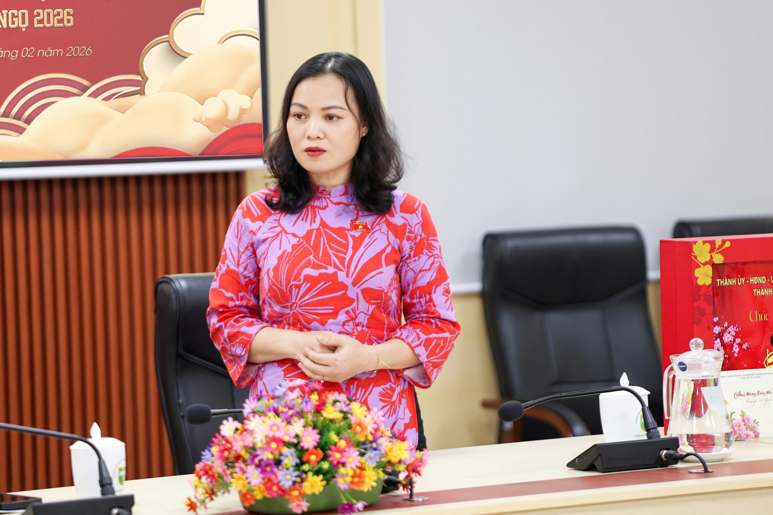 Bà Huỳnh Thị Phúc - Trưởng đoàn Đại biểu Thành phố (Đoàn số 51) chia sẻ định hướng, các nhiệm vụ trọng tâm trong thời gian tới của Ủy ban Thành phố và gửi lời chúc Tết đến Thầy Cô Trường. (Ảnh: VPT)