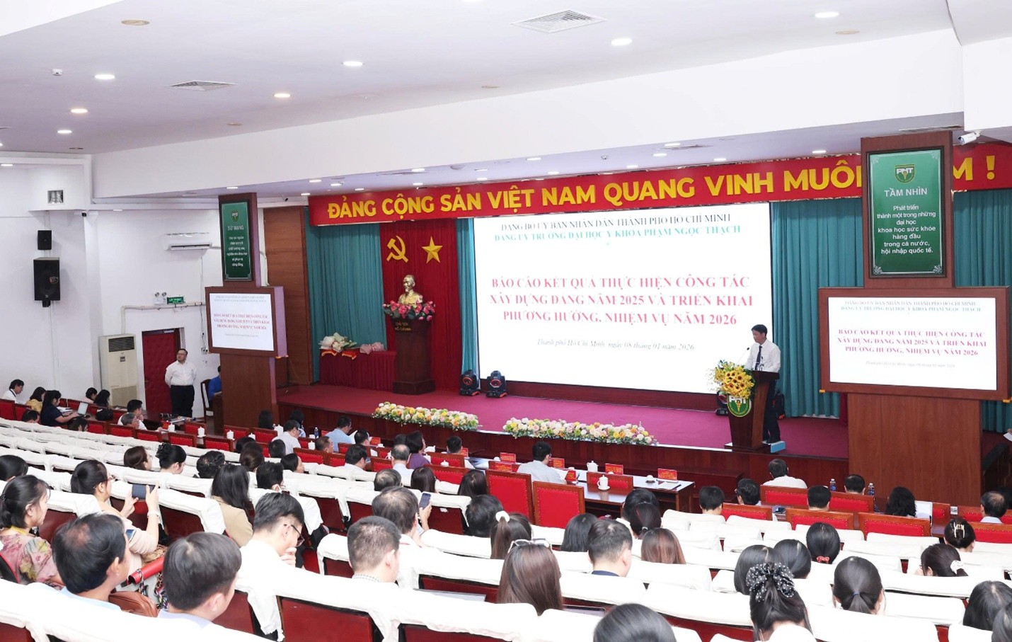 Đại biểu đại diện các cấp lãnh đạo chụp ảnh lưu niệm tại Hội nghị tổng kết công tác xây dựng Đảng năm 2025 Trường Đại học Y khoa Phạm Ngọc Thạch. (Ảnh: VPT cung cấp)