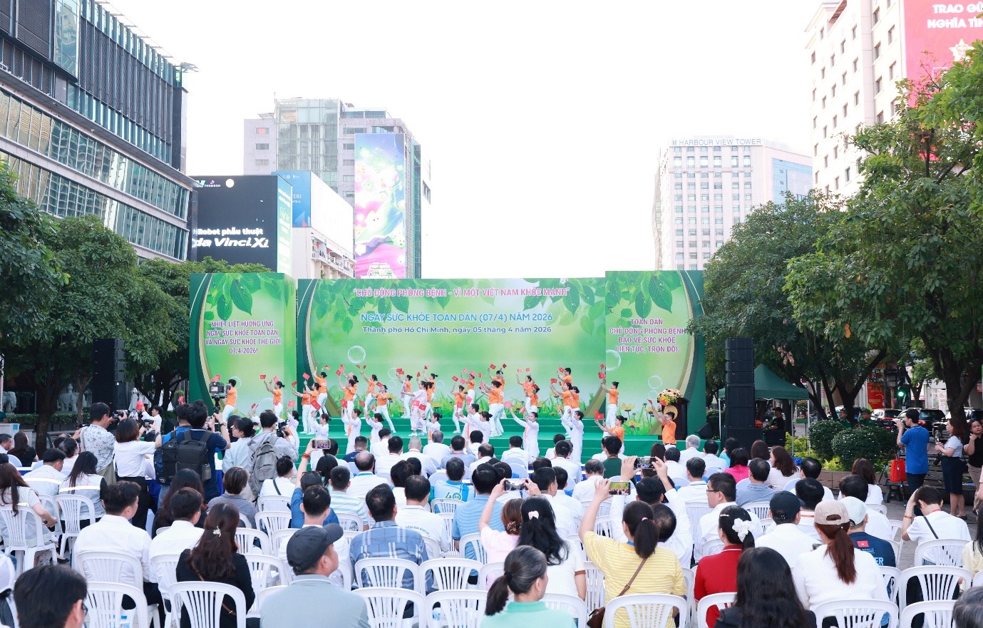 Lễ mít tinh hưởng ứng Ngày Sức khỏe toàn dân và Ngày Sức khỏe thế giới (7-4) với hơn 1.000 người tham gia tại Phố đi bộ Nguyễn Huệ, TP.HCM sáng 5-4. (Ảnh: VPT)
