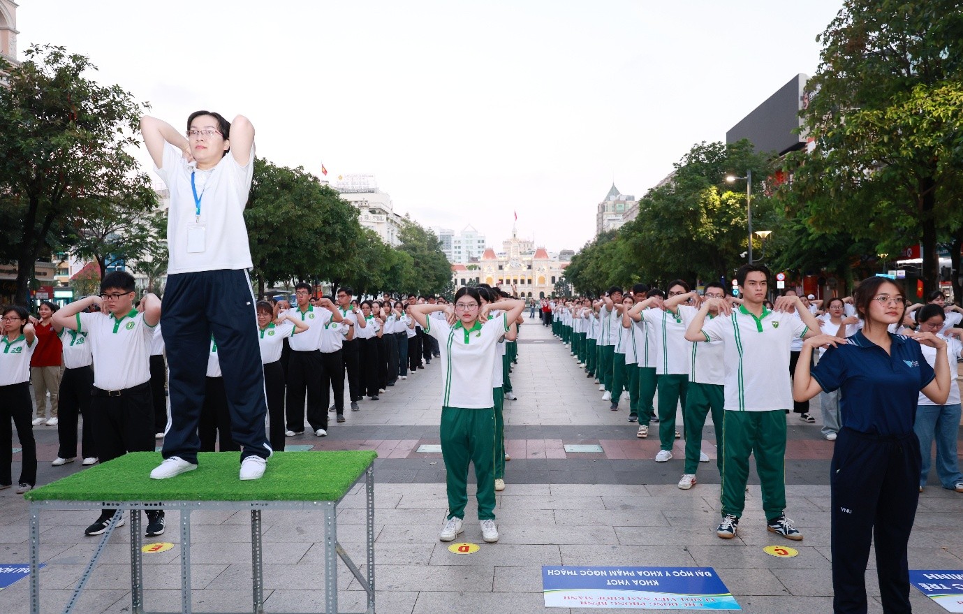 Về phía PNTU có sự tham dự của PGS.TS.BS. Nguyễn Thị Ngọc Dung - Chủ tịch Hiệp hội Y học TP.HCM, Nguyên Hiệu trưởng Nhà trường; TS.BS. Võ Thị Ngọc Hà - Trưởng Ban đào tạo Khoa Y dược cổ truyền, cùng đội hình đồng diễn gồm 70 sinh viên và giảng viên Khoa Y dược cổ truyền.