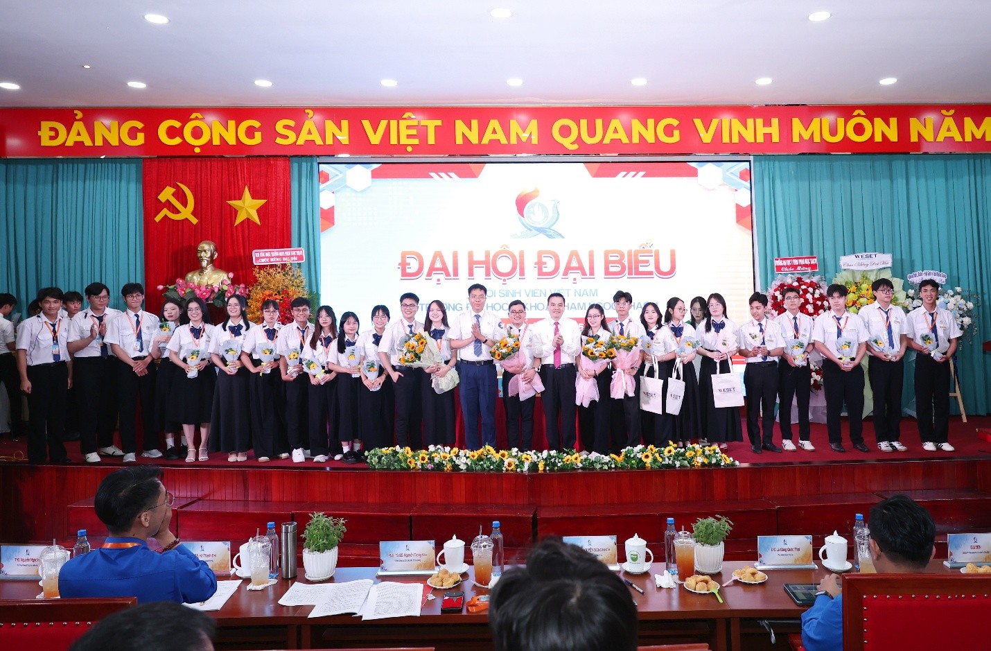 PGS.TS.BS. Nguyễn Trọng Hào - Bí thư Đảng ủy, Chủ tịch Hội đồng; PGS.TS.DS. Nguyễn Đăng Thoại - Phó Hiệu trưởng phụ trách quản lý, điều hành; Đ/c Nguyễn Đăng Khoa - Phó Bí thư, Chủ nhiệm Ủy ban Kiểm tra Thành đoàn, Chủ tịch Hội Sinh viên Việt Nam TP.HCM và các đồng chí Công Đoàn Trường, Phòng Công tác Sinh viên, Đoàn Thanh niên - Hội Sinh viên tham dự Đại hội. (Ảnh VPT cung cấp)