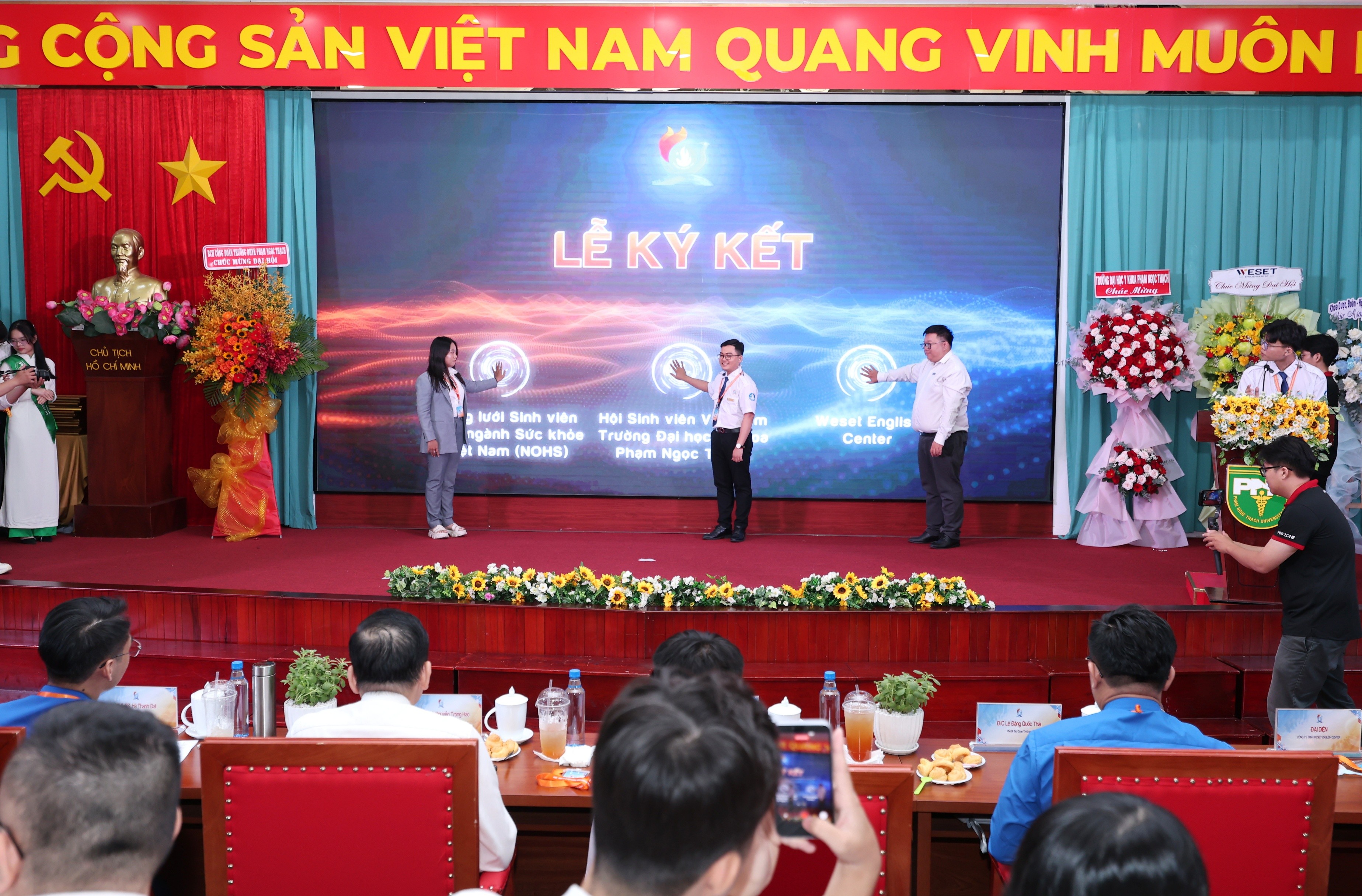 Ngoài ra, Đại hội trân trọng đón tiếp Đ/c Nguyễn Đăng Khoa - Phó Bí thư, Chủ nhiệm Ủy ban Kiểm tra Thành đoàn, Chủ tịch Hội Sinh viên Việt Nam TP.HCM; Chị Trịnh Hồng Bảo Hân - Chủ tịch Mạng lưới Sinh viên Khối ngành Sức khỏe Việt Nam, cùng đại diện các đơn vị phối hợp, lãnh đạo Đoàn Thanh niên các phường Tân Tạo, Thuận Giao, Tân Nhựt, An Đông và các lãnh đạo Hội Sinh viên từ các trường Đại học, Cao đẳng trên địa bàn, ghi dấu sự kết nối và đồng hành trong công tác Hội và phong trào sinh viên với Trường Đại học Y khoa Phạm Ngọc Thạch.