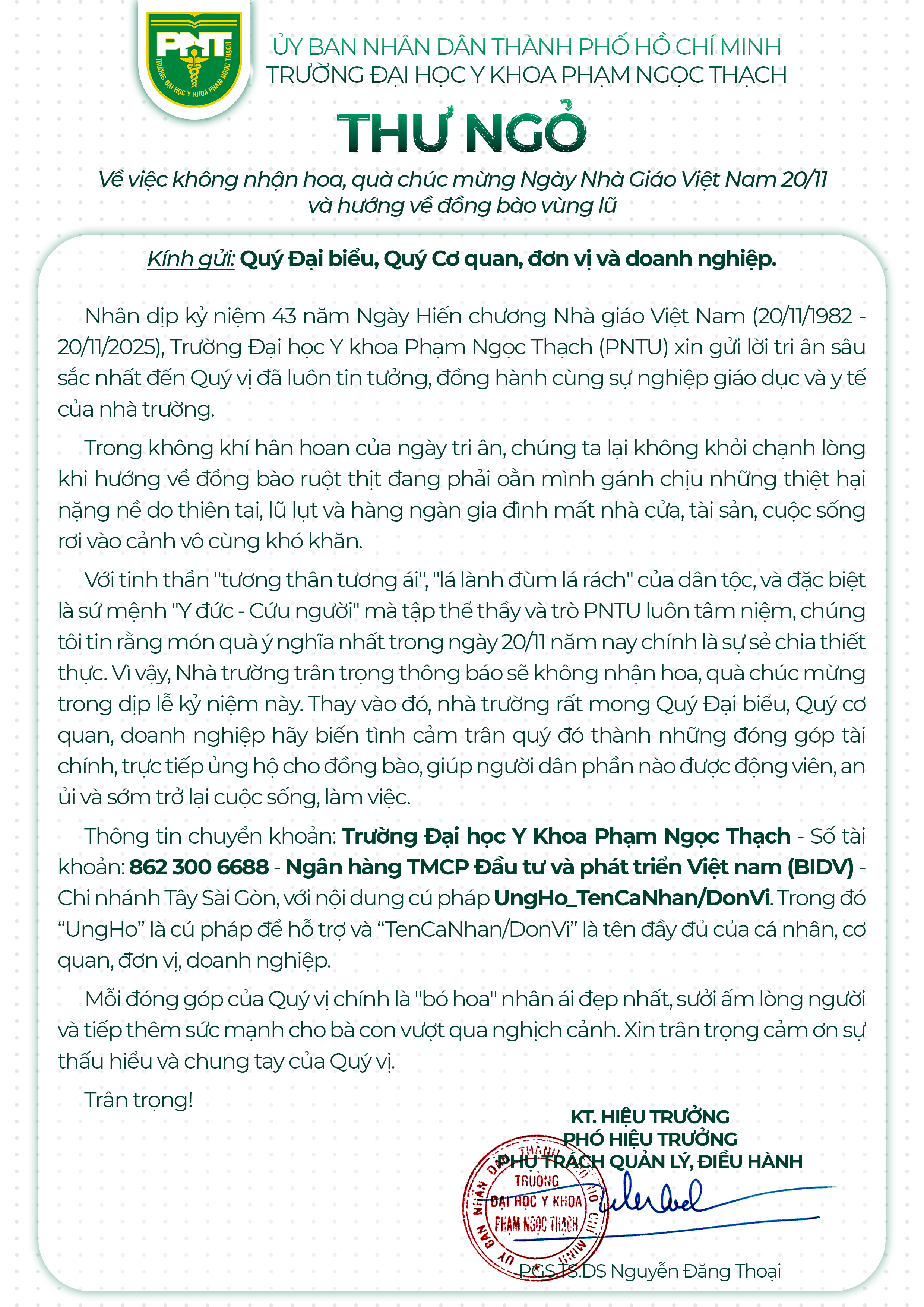 Trường Đại học Y khoa Phạm Ngọc Thạch kính gửi đến Quý đại biểu, Quý cơ quan, đơn vị và doanh nghiệp Thư ngỏ về việc không nhận hoa, quà chúc mừng Ngày Nhà Giáo Việt Nam 20/11 và hướng về đồng bào vùng lũ.