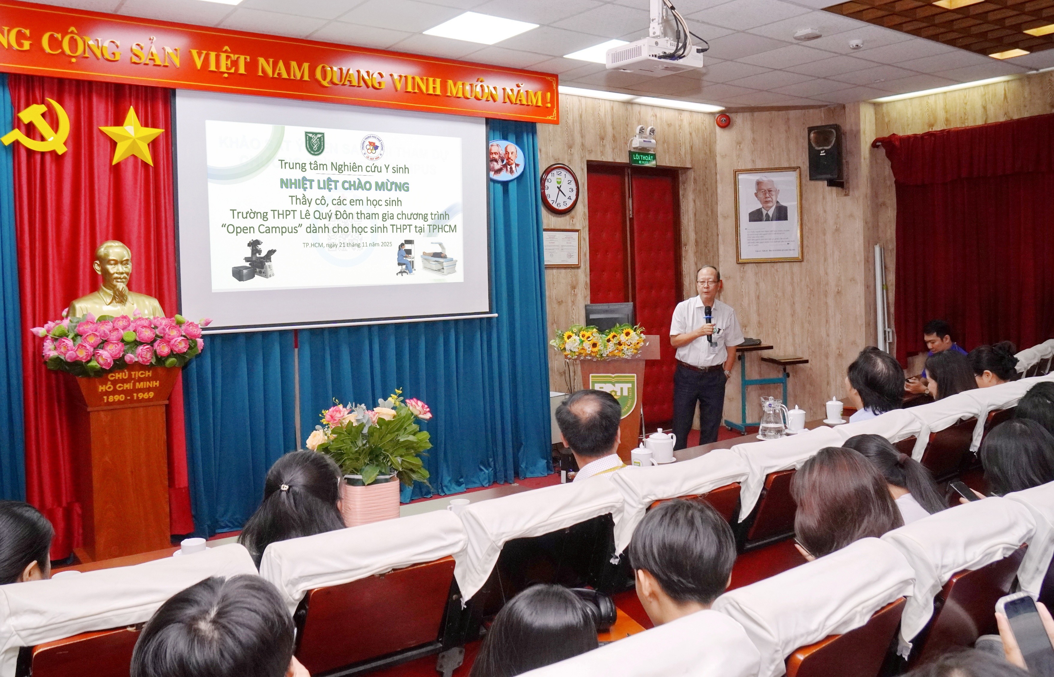 PGS.TS.BS. Trần Công Toại - Trưởng Trung tâm Xét nghiệm và Nghiên cứu Y sinh chia sẻ, tư vấn cho đoàn học sinh Trường THPT Lê Quý Đôn đến tham quan và trải nghiệm. (Ảnh: VPT cung cấp)
