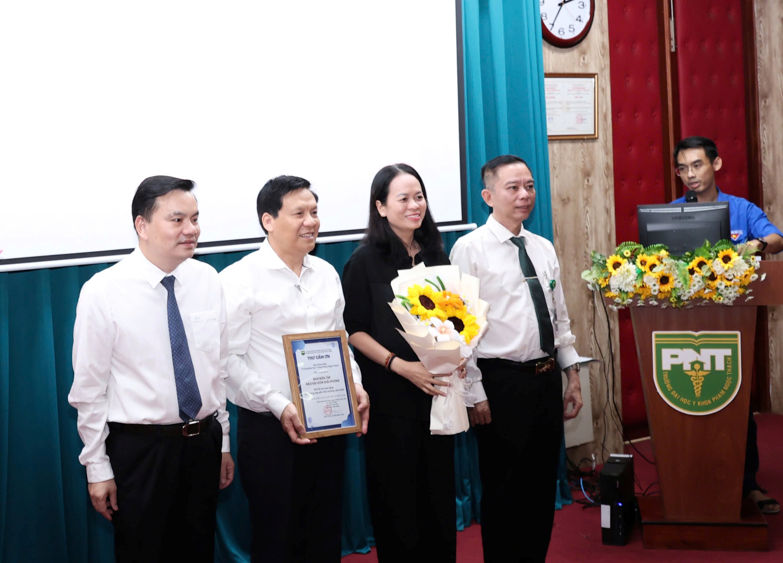Đại diện Ban Giám hiệu Trường Đại học Y khoa Phạm Ngọc Thạch trao thư và hoa cảm ơn Báo Sài Gòn Giải Phóng. (Ảnh: VPT cung cấp)