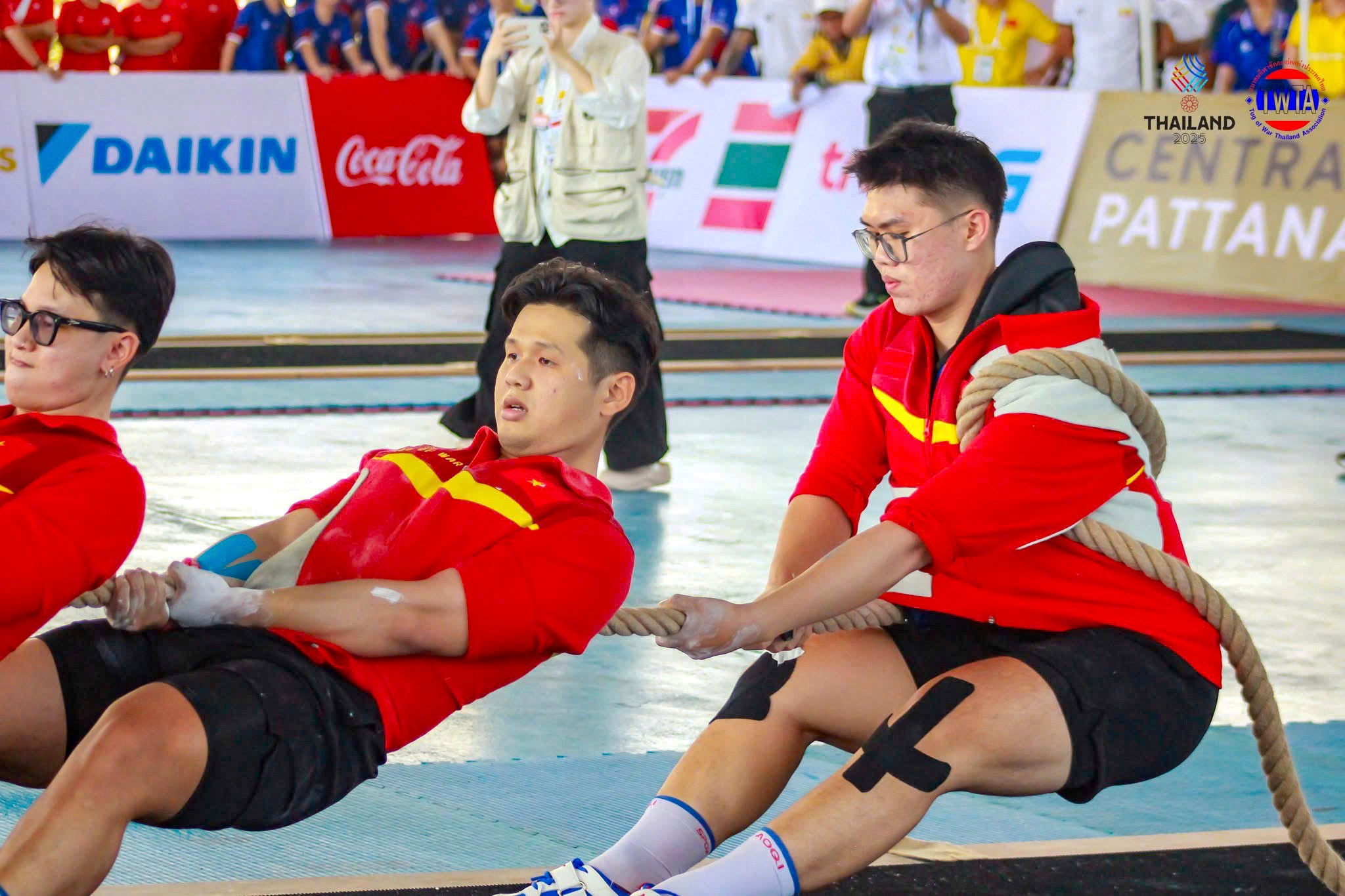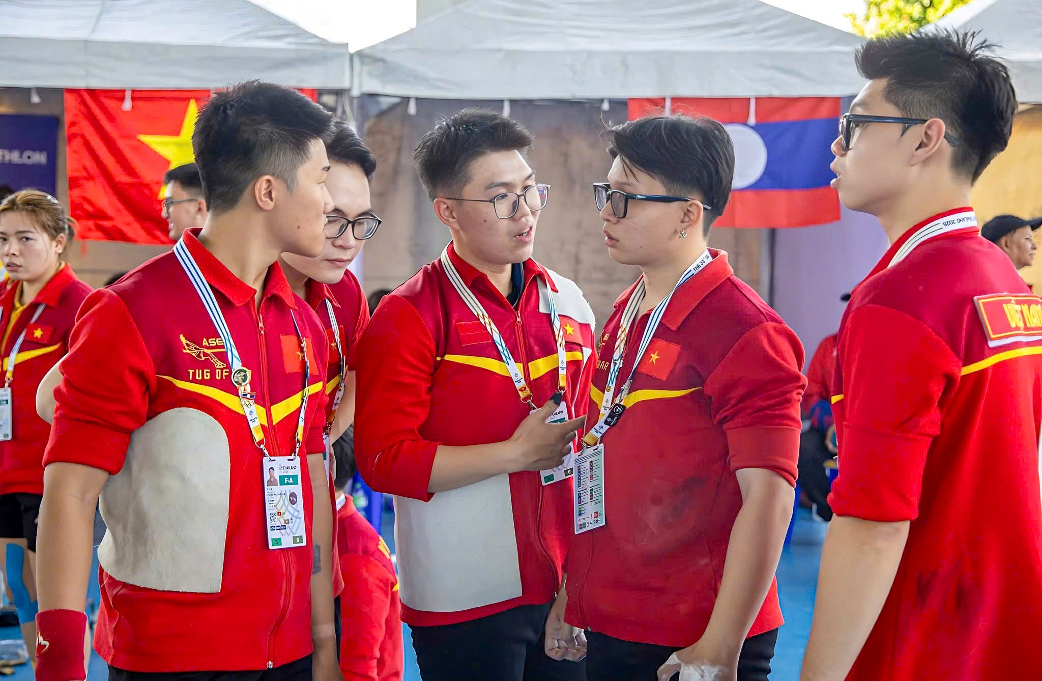 Luật cùng đồng đội hội ý trong trận đấu kéo co tại SEA Games 33. (Ảnh: NVCC)